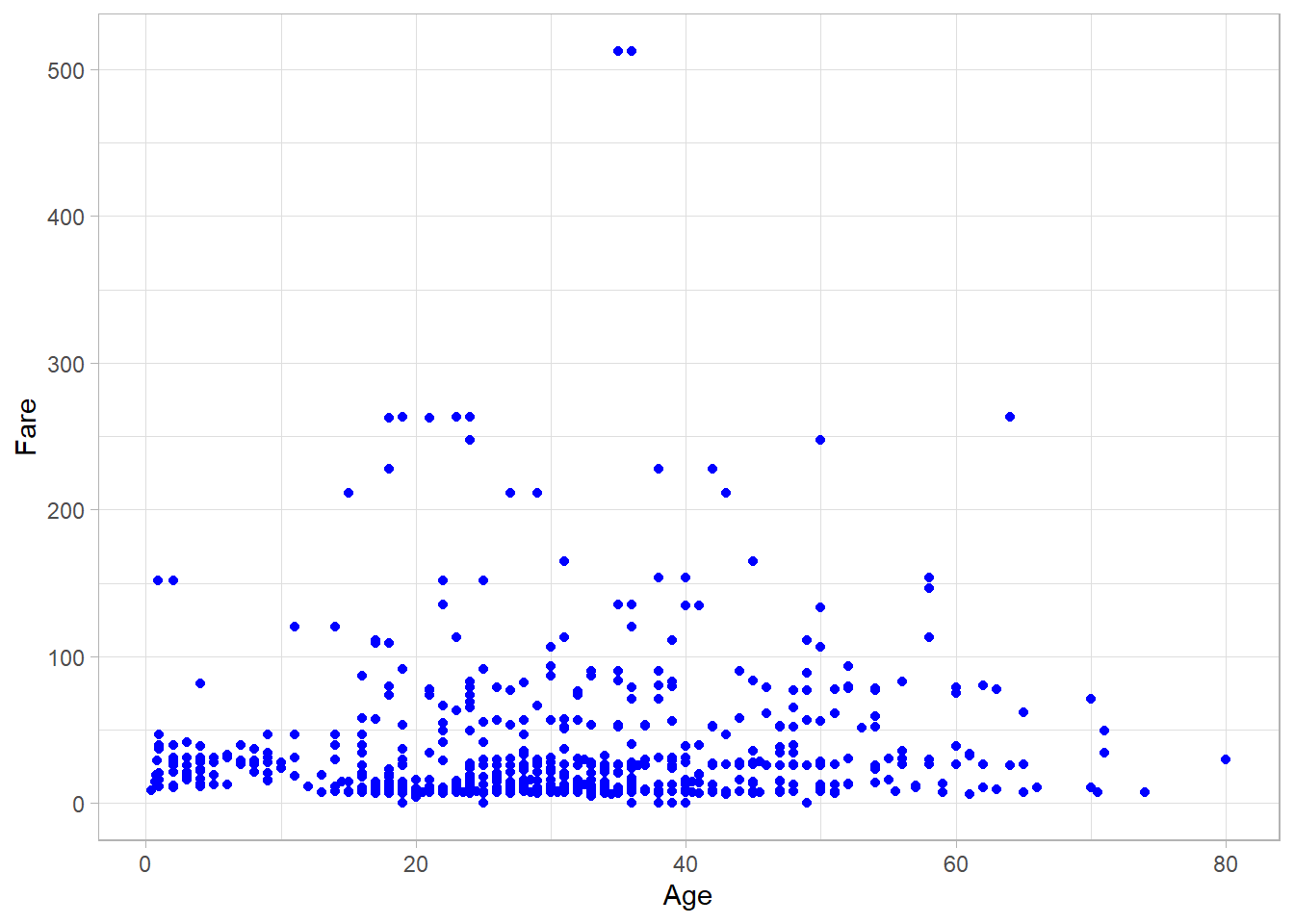 There is no strong association between these two variables—older passengers could have either cheaper or more expensive tickets compared to younger passengers. In statistical terms, there is no clear correlation between Age and Fare.
