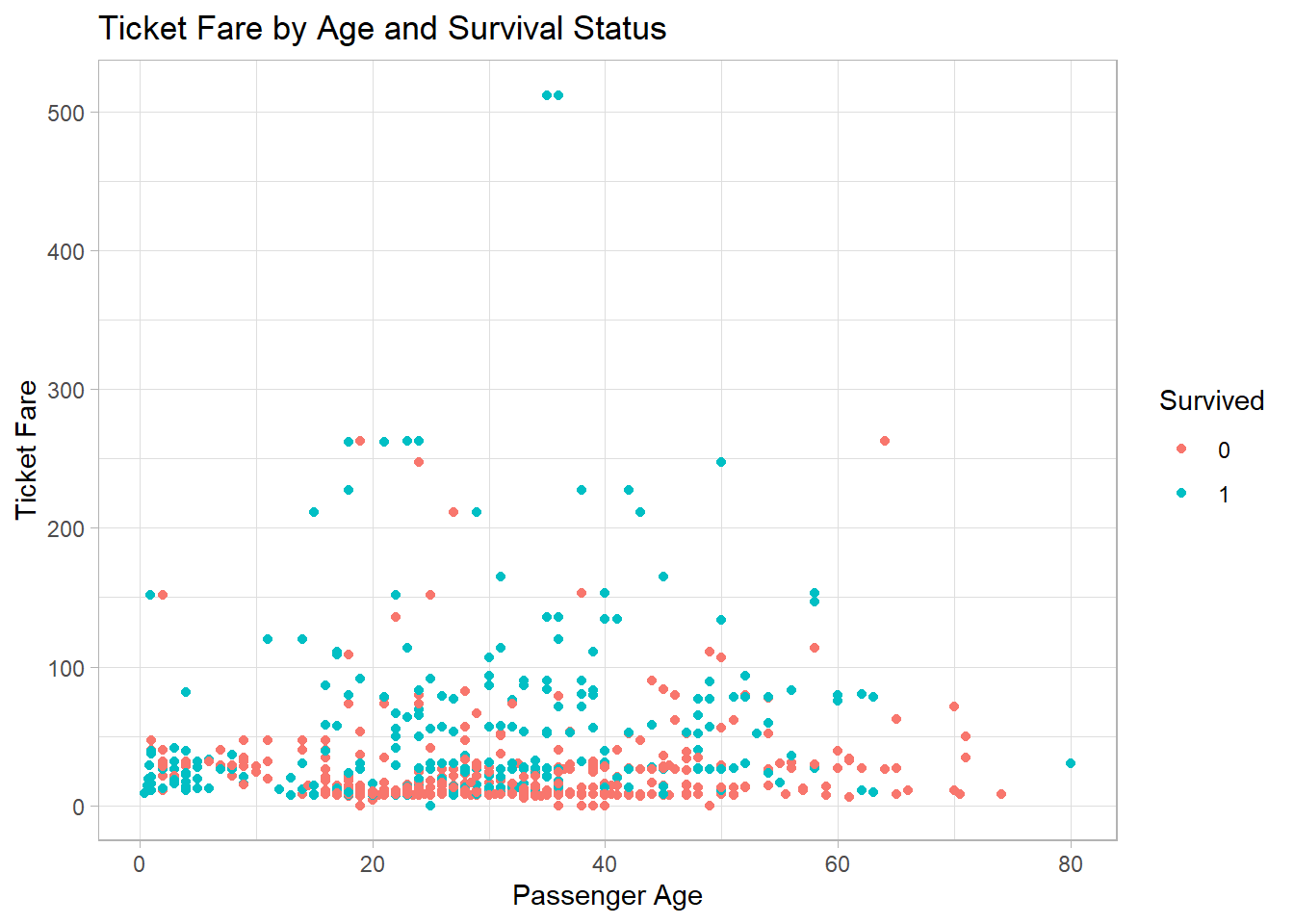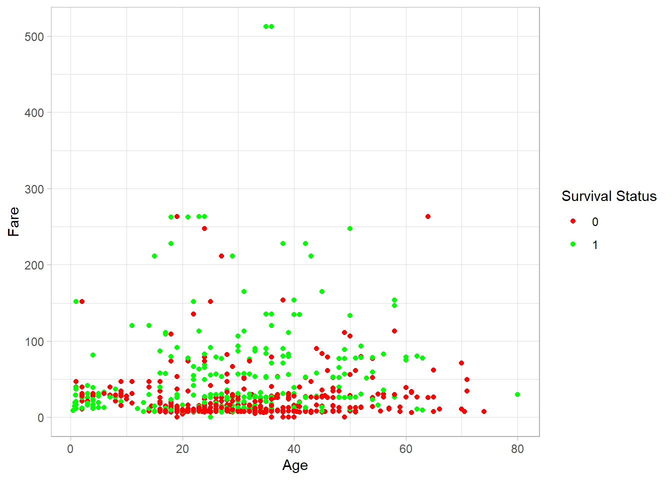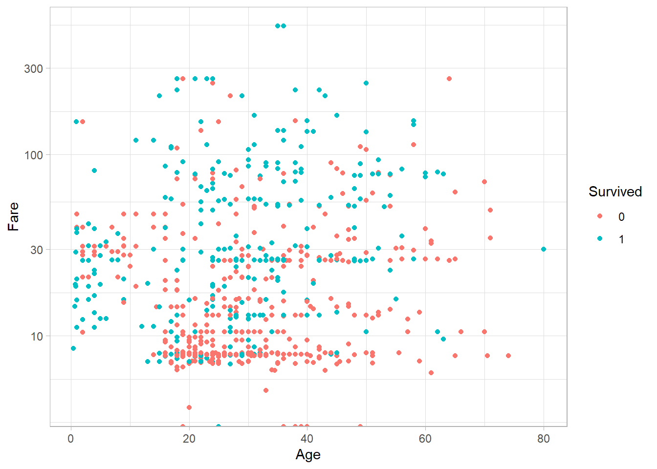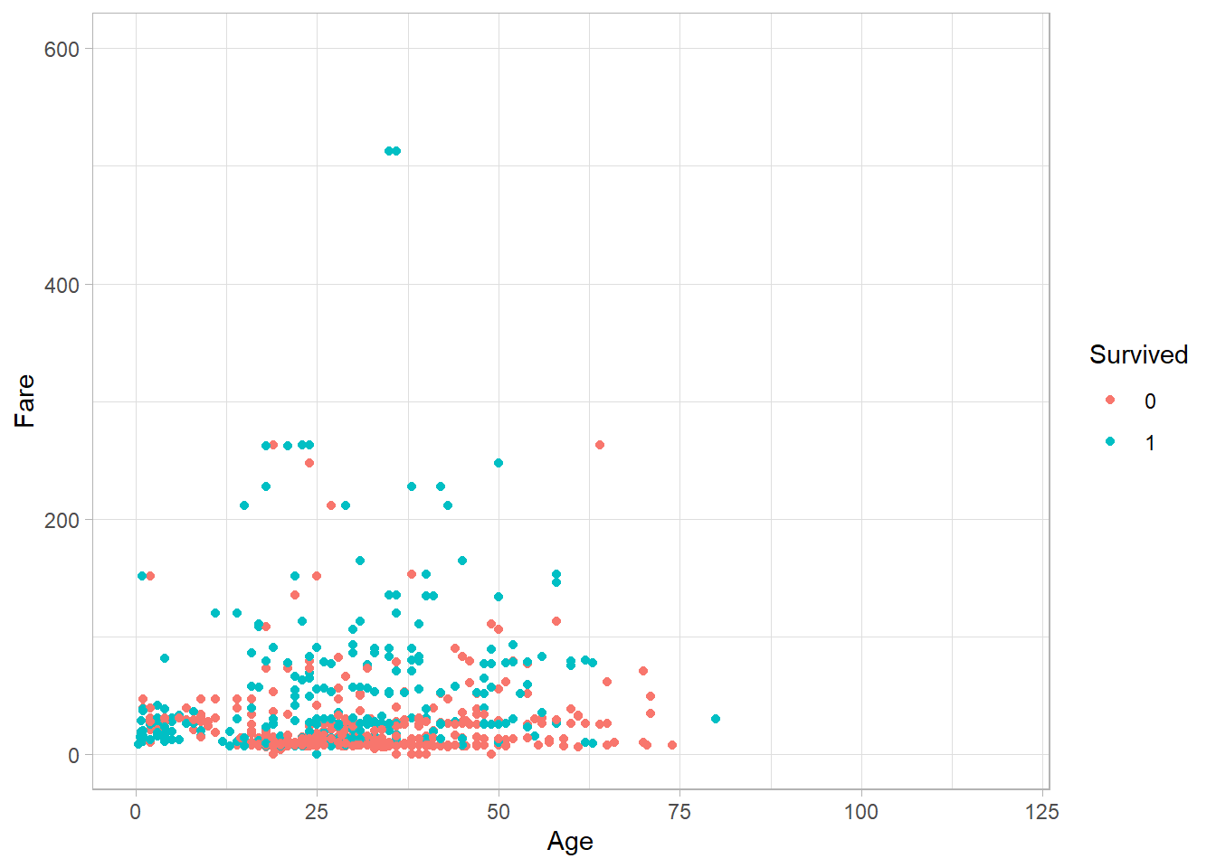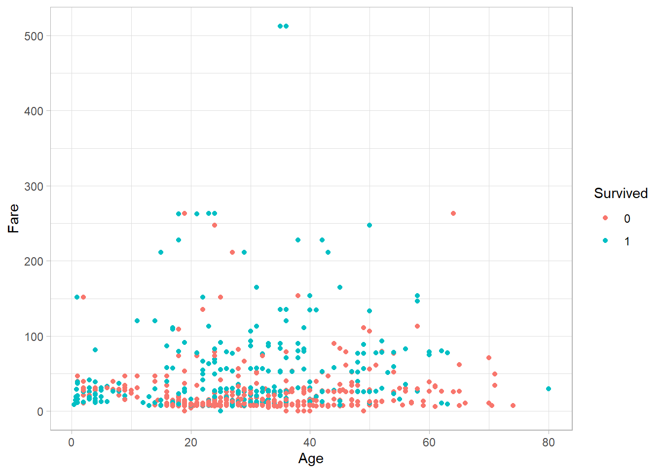Besides the x and y axes, we can map more variables to additional aesthetics while still keeping the plot two-dimensional. For instance, we can add the Survived variable to color the points in the scatter plot: