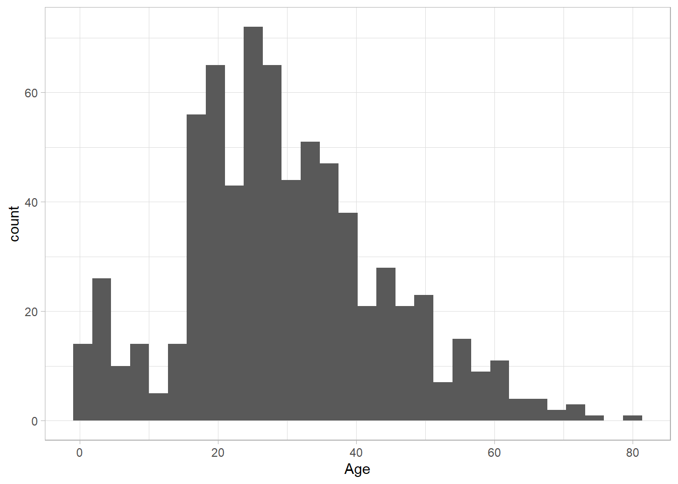 Similar to geom_histogram(), the y-axis here represents the number of observations. In fact, a bar plot can be thought of as a histogram for categorical variables, where each “bin” corresponds to a specific category. This plot shows that most passengers on the Titanic did not survive.