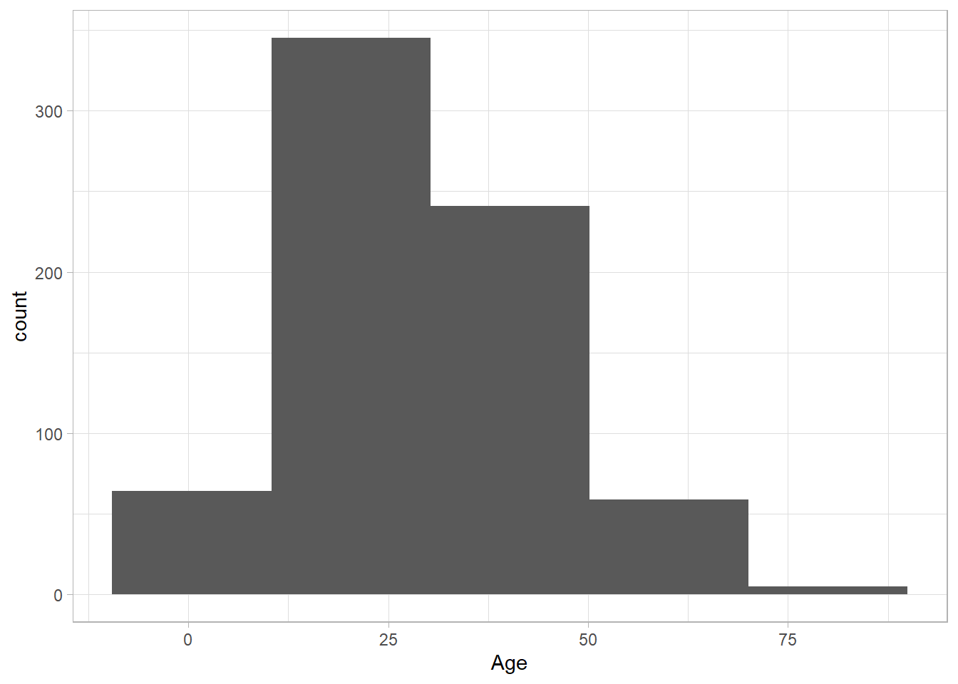Let’s create a box plot for the Age variable using geom_boxplot():