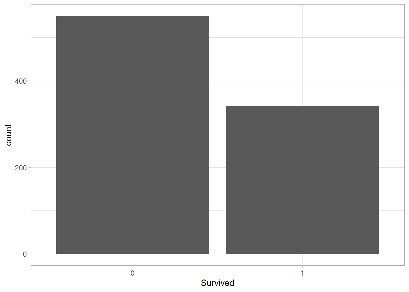 Bar plots are an excellent choice for visualizing categorical data. To create a bar plot, we use the geom_bar() function. As with histograms and density plots, we need to include only one variable on the x-axis. Let’s plot the Survived variable: