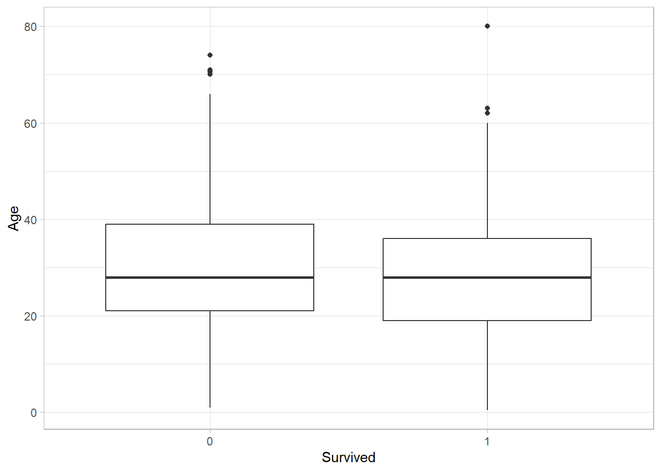 While histograms or density plots are preferred when visualizing the distribution of a single variable, box plots are excellent for comparing distributions across categories. To do this, we place the numeric variable on the y-axis and the categorical variable on the x-axis. For instance, the following plot shows the distribution of Age across survival categories: