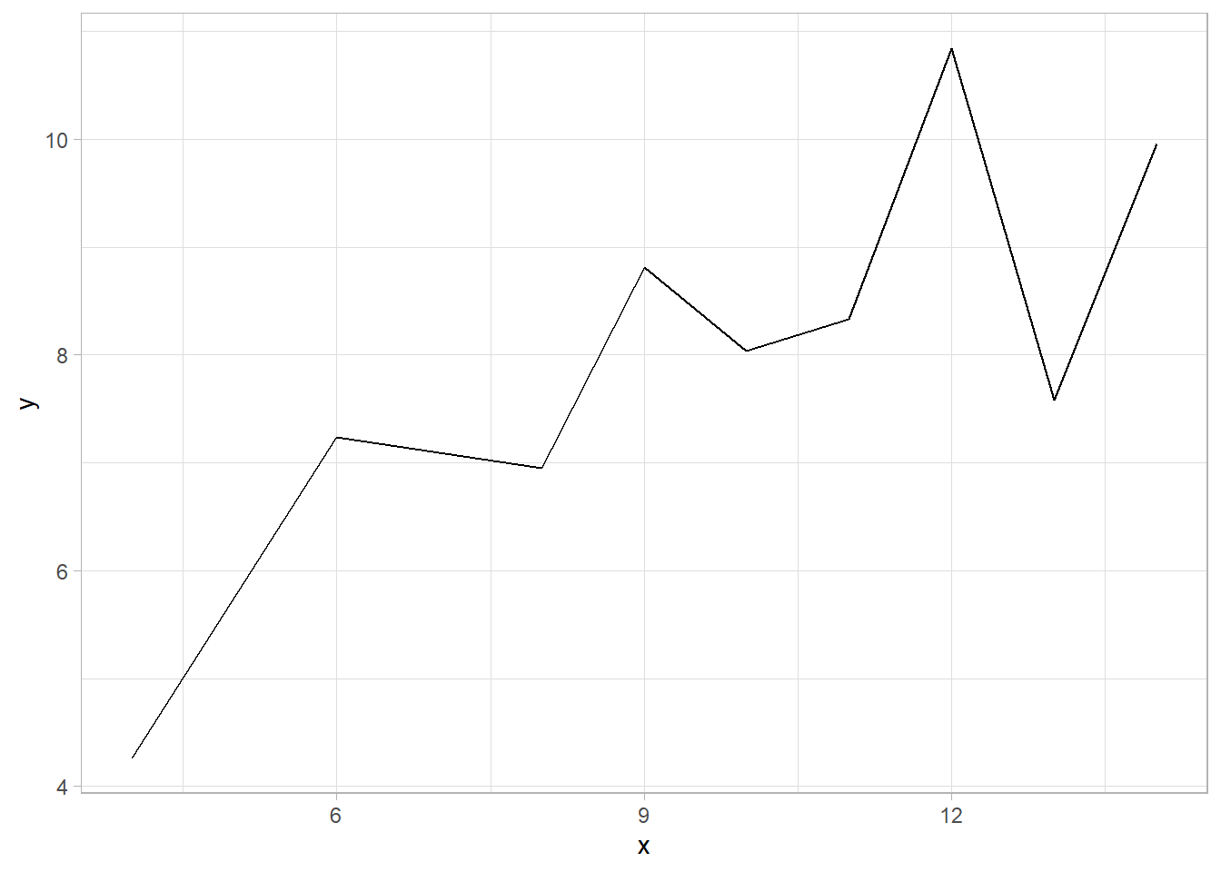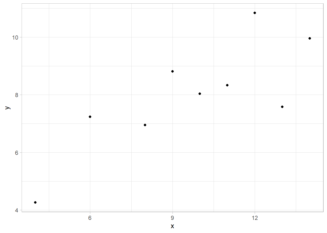 y = c(8.04, 6.95, 7.58, 8.81, 8.33, 9.96, 7.24, 4.26, 10.84)) Since we have two numeric variables, we can first create a scatter plot using the geom_point() function: