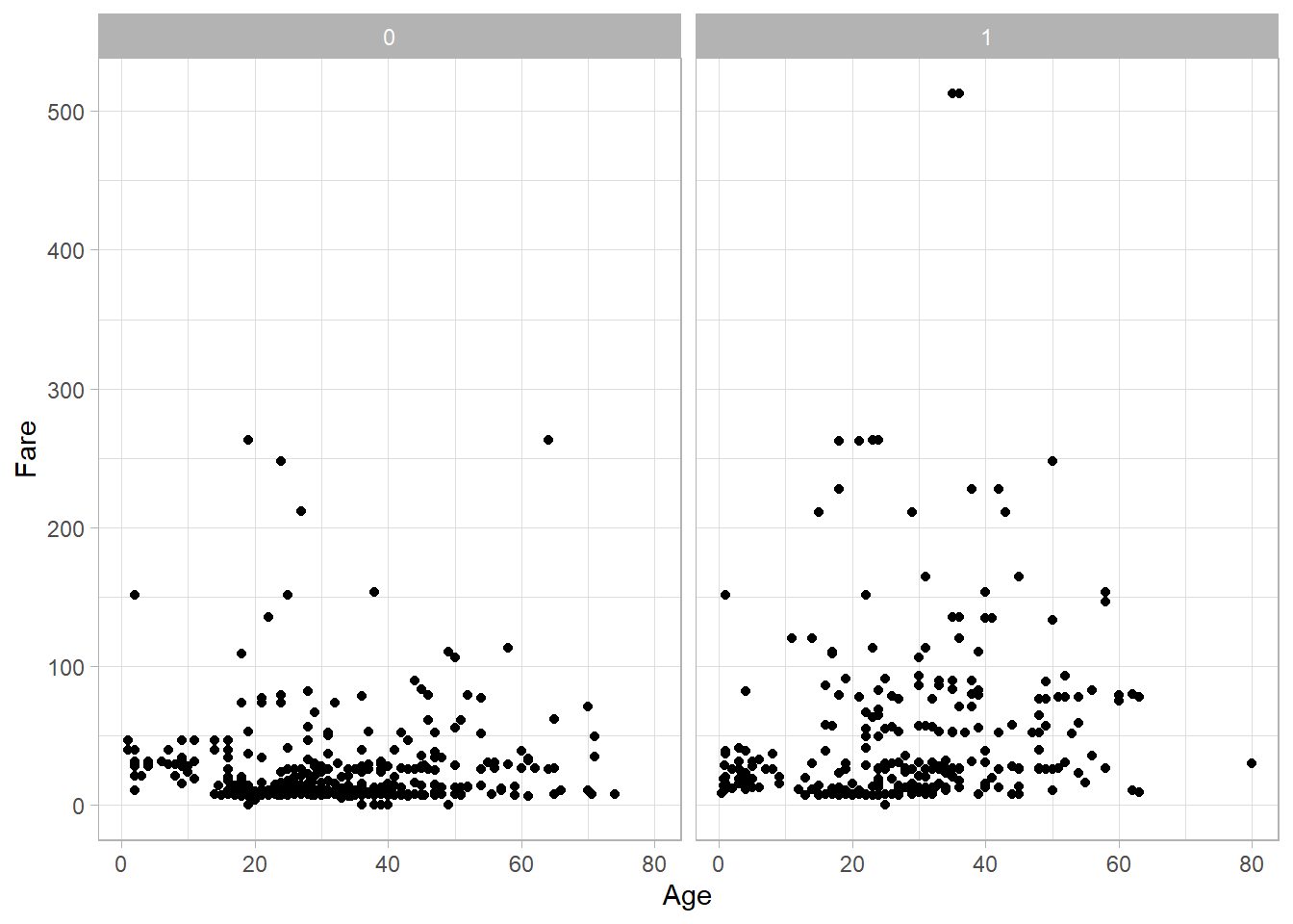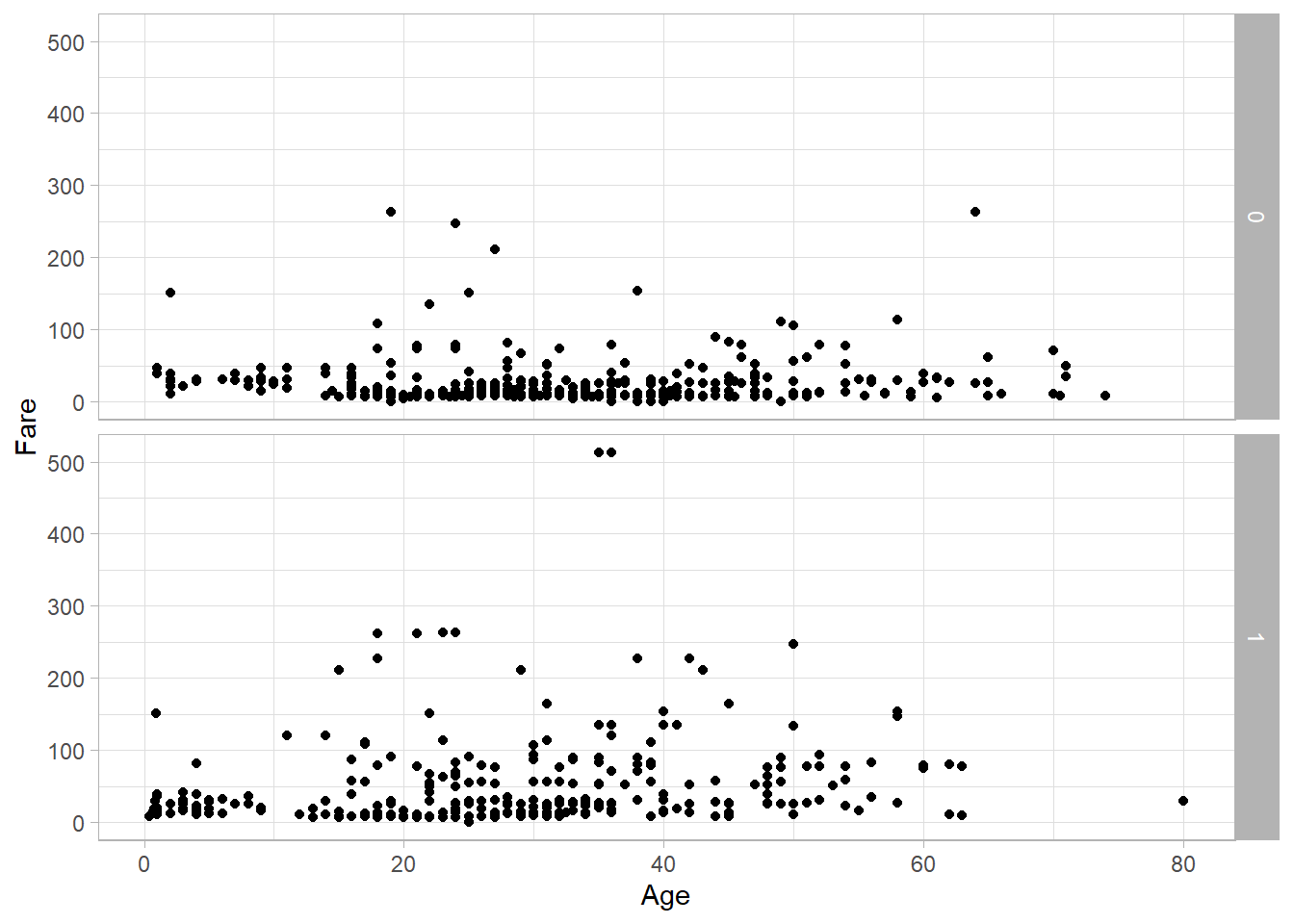 To understand how these two functions work, let’s revisit the scatter plot we created earlier in the chapter. This time, we add facet_grid() to break the plot into two separate scatter plots—one for each category of the Survived variable: