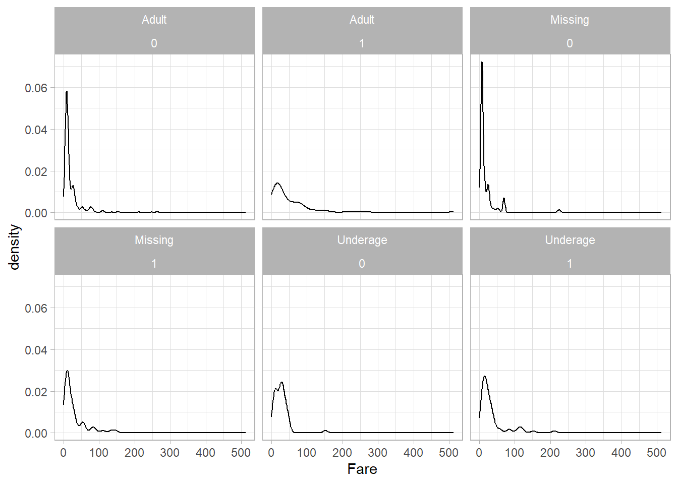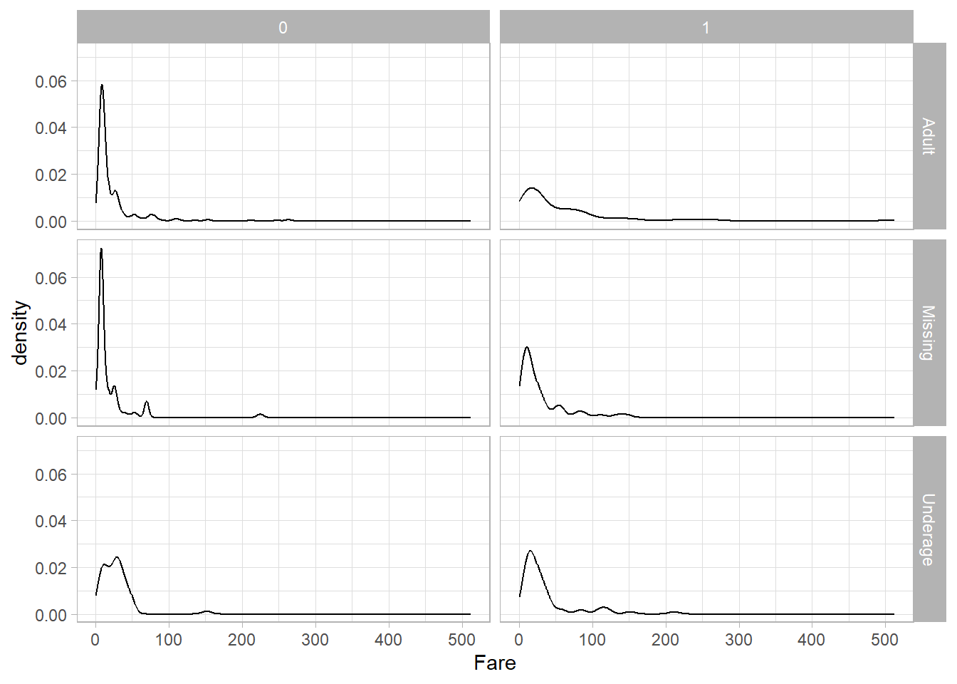 TRUE ~ "Underage"))Now, let’s use facet_grid() to create a grid of density plots for Fare, with Age_Category on the rows and Survived on the columns: