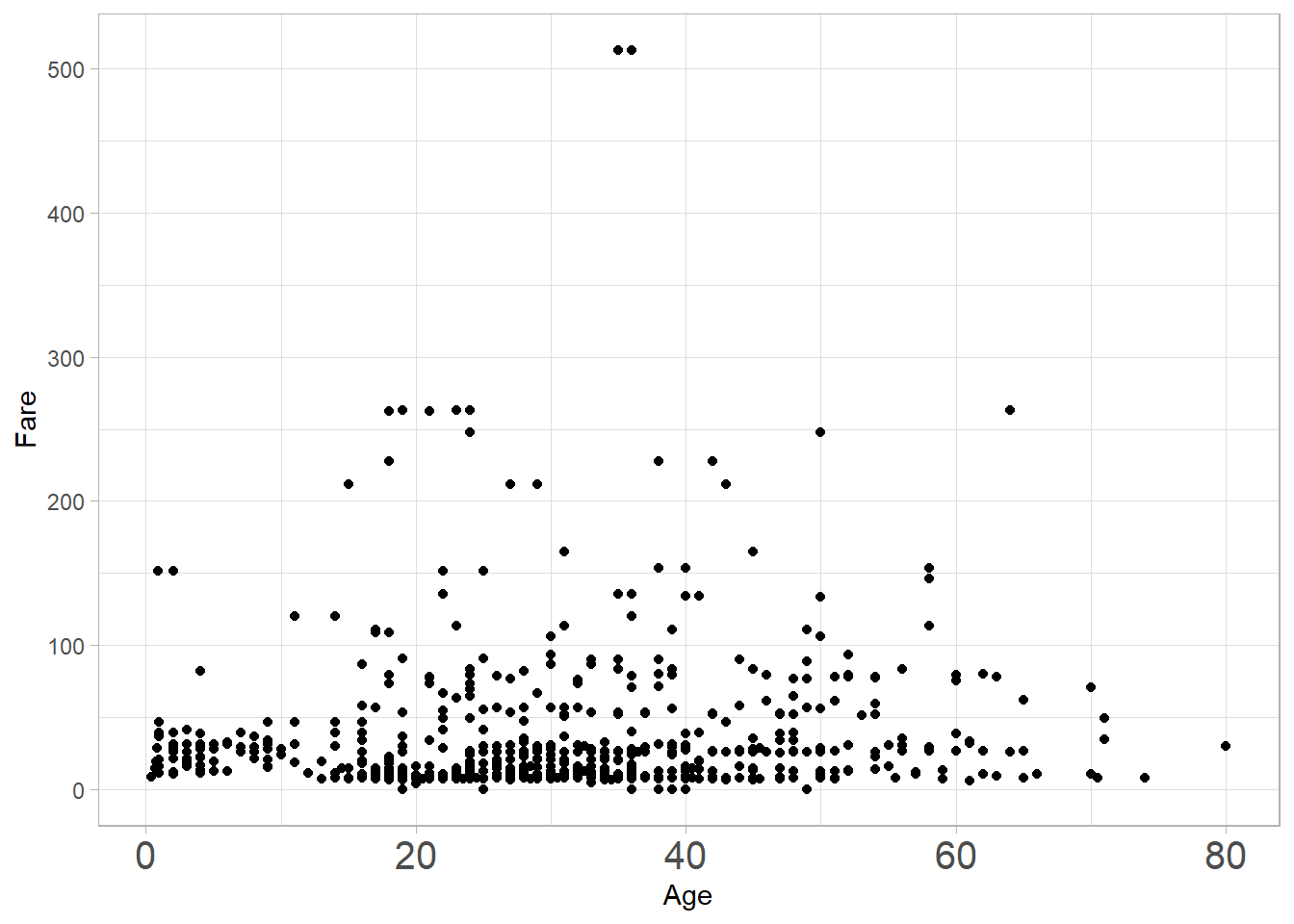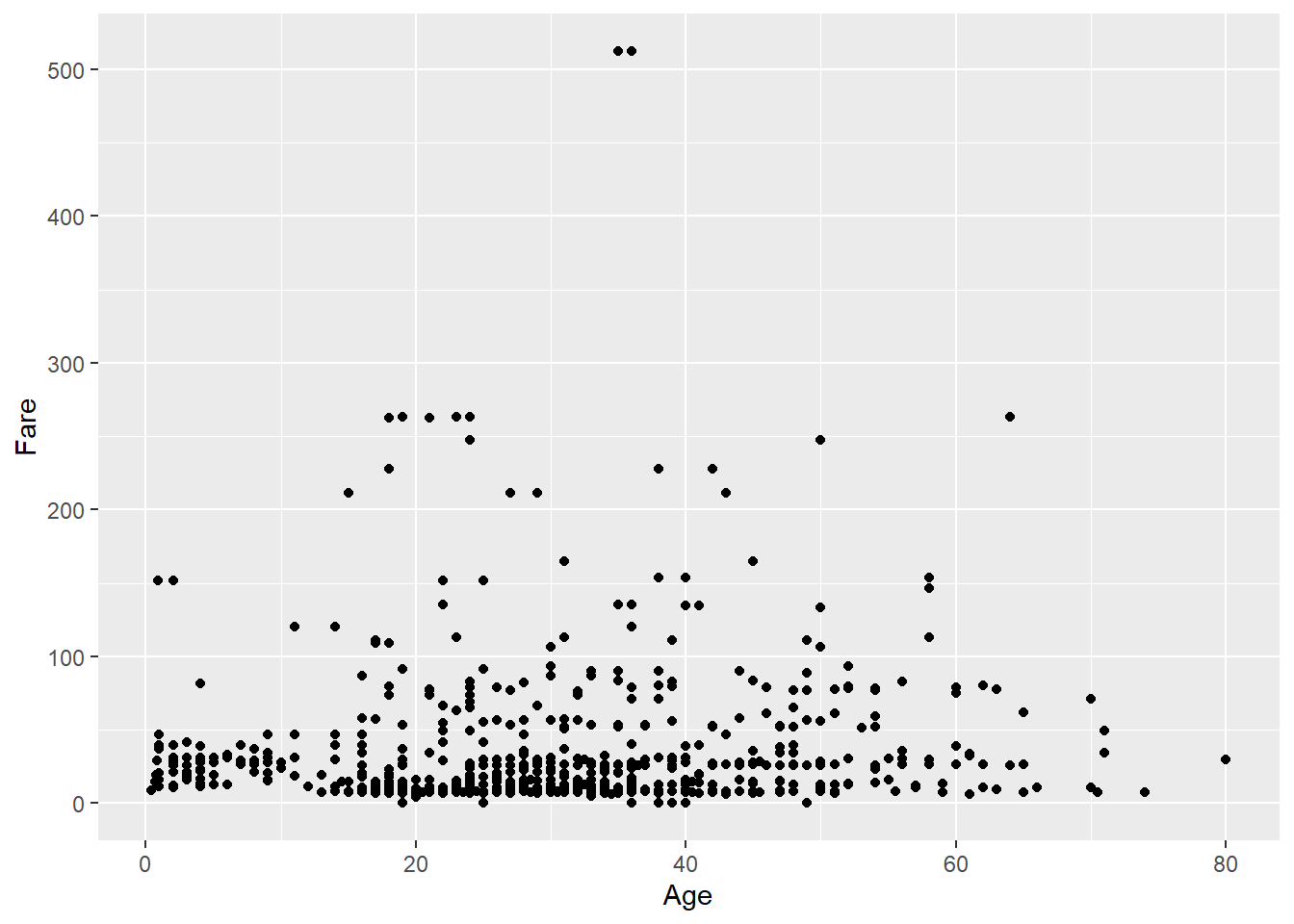 ggplot(mapping = aes(x = Age, y = Fare)) +