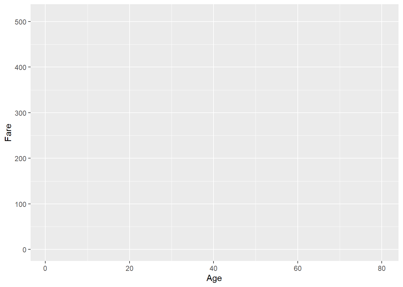 Once the dataset is chosen, we decide on the aesthetics, meaning which variables will be mapped to visual elements of the plot. Aesthetics include everything we write inside the aes() function. In the previous example, we included Age and Fare in aes(). Although we didn’t see any shapes on the plot at that point, we could already see the x and y axes labeled, meaning those aesthetics have been mapped.