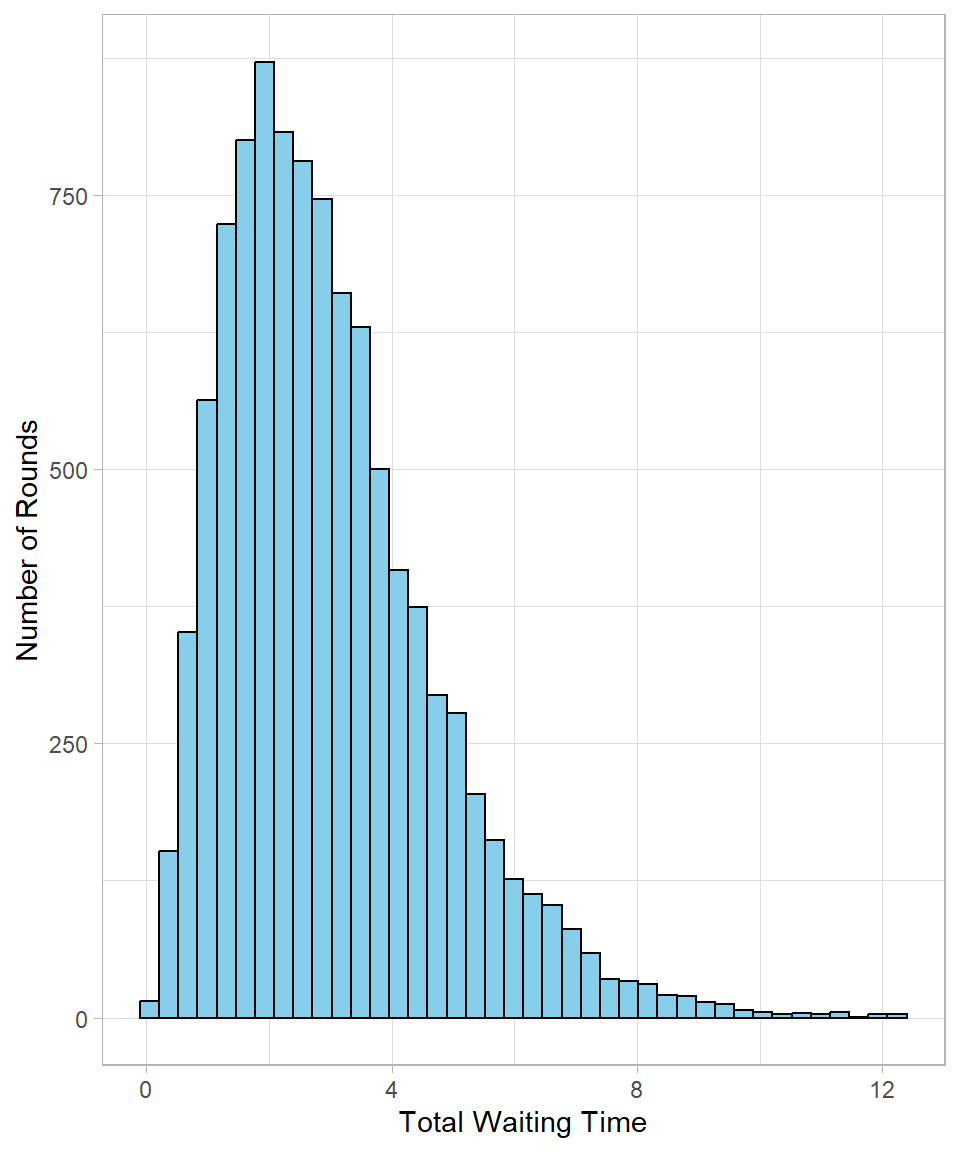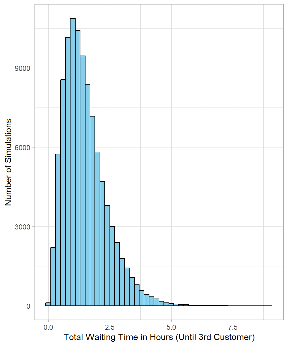 This histogram shows the distribution of total waiting times until the third customer arrives. Most values cluster around the center, with a tail extending to the right—typical of gamma distributions when \(\alpha > 1\).