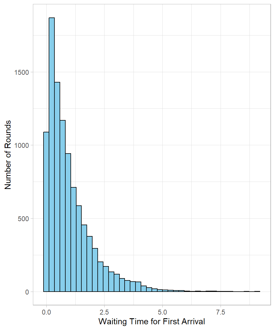 The resulting distribution is right-skewed, continuous, and always positive—exactly what we would expect for waiting times. Most values concentrate around a central range, but there is always a chance of longer waits.