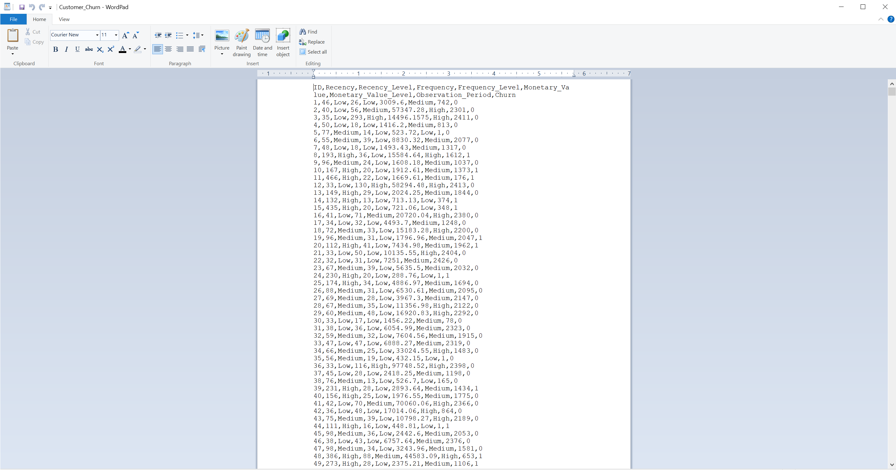 Data sets are typically stored in all kinds of formats. Probably the most common type is the table form or electronic spreadsheet (e.g., Excel format). A spreadsheet is similar to a data frame or matrix, because it consists of rows and columns. The type of file determines how we import it into R. Common file types include Excel workbooks, CSV files, or text files with specific delimiters such as tabs or semicolons. For instance, a CSV file (Comma-Separated Values) uses commas to separate values within each row. Understanding these file types is crucial because it influences how data is read into R using appropriate functions or packages. For instance, the file Customer_Churn below is seen with a text editor: