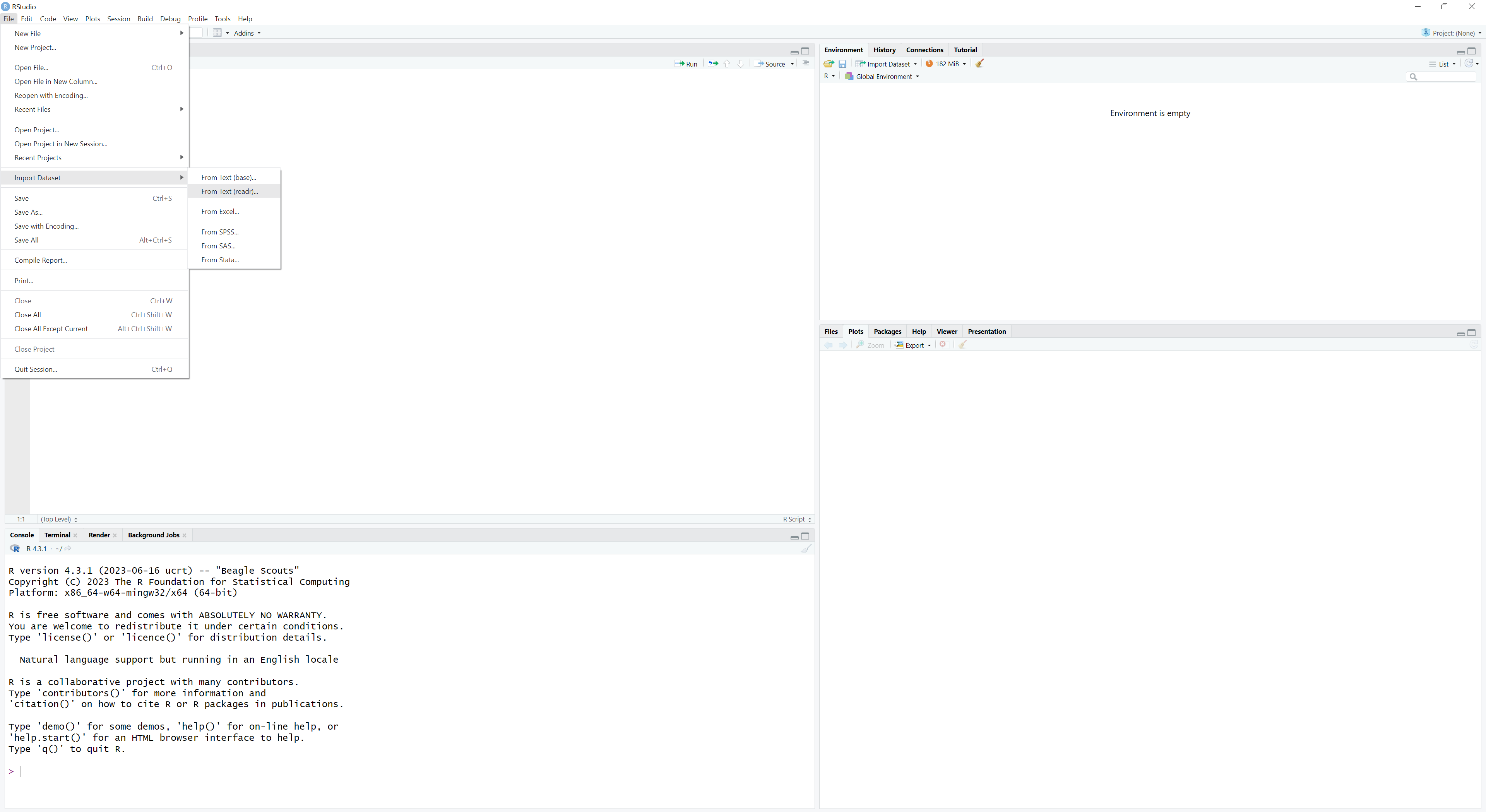 However, RStudio also provides a user-friendly functionality that can help us import our data sets in a relatively straightforward manner. By choosing File -> Import Dataset, we can see that RStudio provides us with different options, such as From Text (readr)…. By clicking this option, we will see the following output: