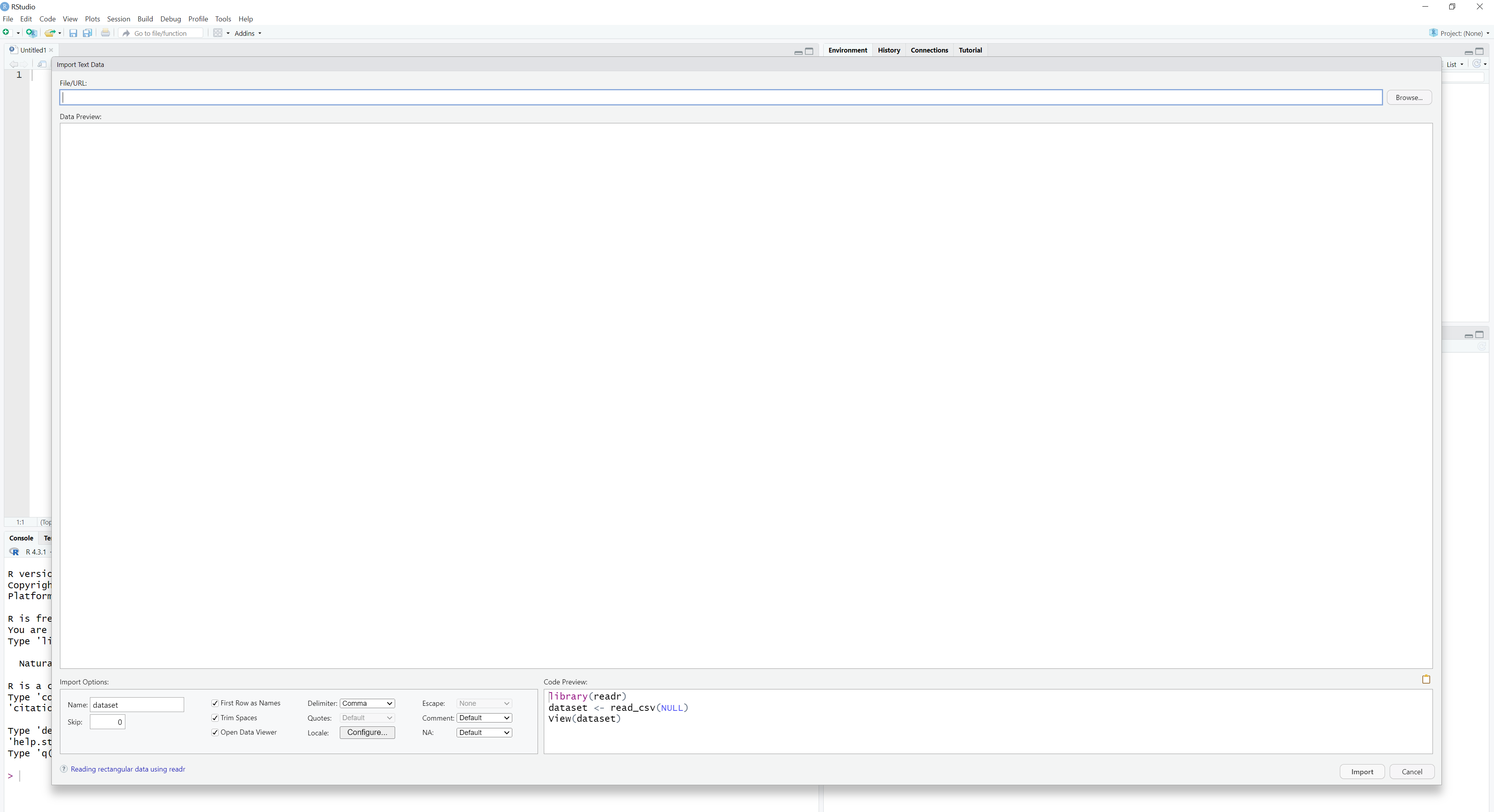 Here, we have a number of options that allow us to change how RStudio imports the file. In this way, we see exactly what RStudio will import and, respectively, we can make adjustments before the import takes place. Lastly, we see the exact R code that makes the import on the bottom right corner on the bottom right corner. This is very valuable because not only can we use this code later, but also we can learn how to import a data set by coding directly on the console. In this example, we note that RStudio used the readr package and the function read_csv() to make this import possible. This function can be thought of as an advanced version of the read.csv() function. The details are not important at this point; our goal is to capture the intuition about paths, directory and the overall functionality of RStudio regarding data import.