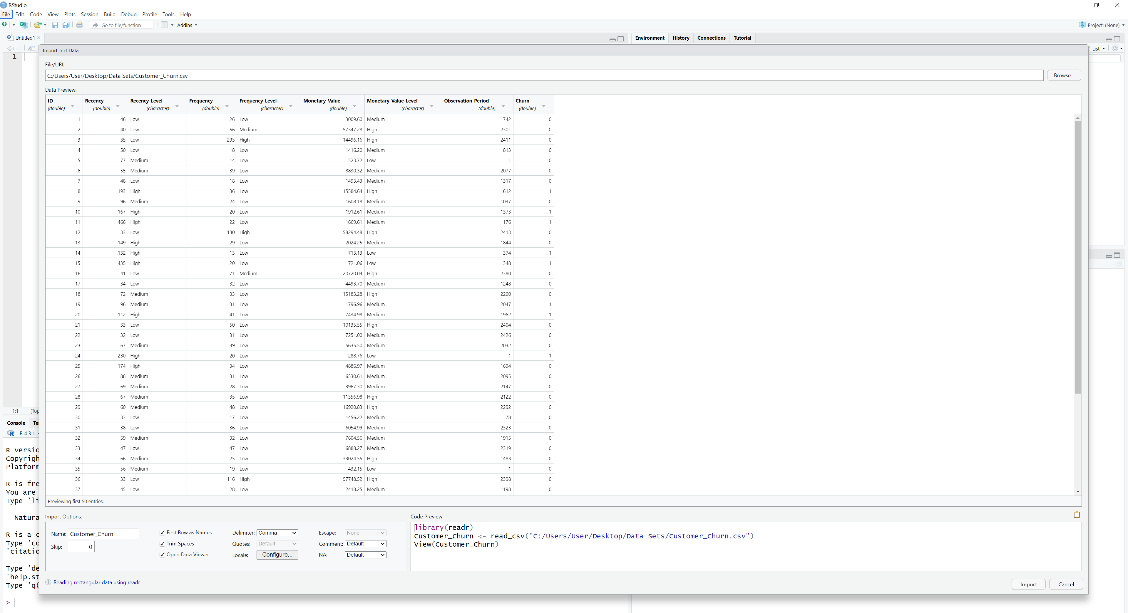 Now that we understand the concepts of path and directory, we can examine in practice how to import a data set in R by using the RStudio functionality. To keep things simple, we import the same data set with the same full path as described. So, the csv file that we import is called Customer_Churn and the directory path is C:/Users/User/Desktop/Data Sets. As shown earlier, we can use the read.csv() function to import this data set.