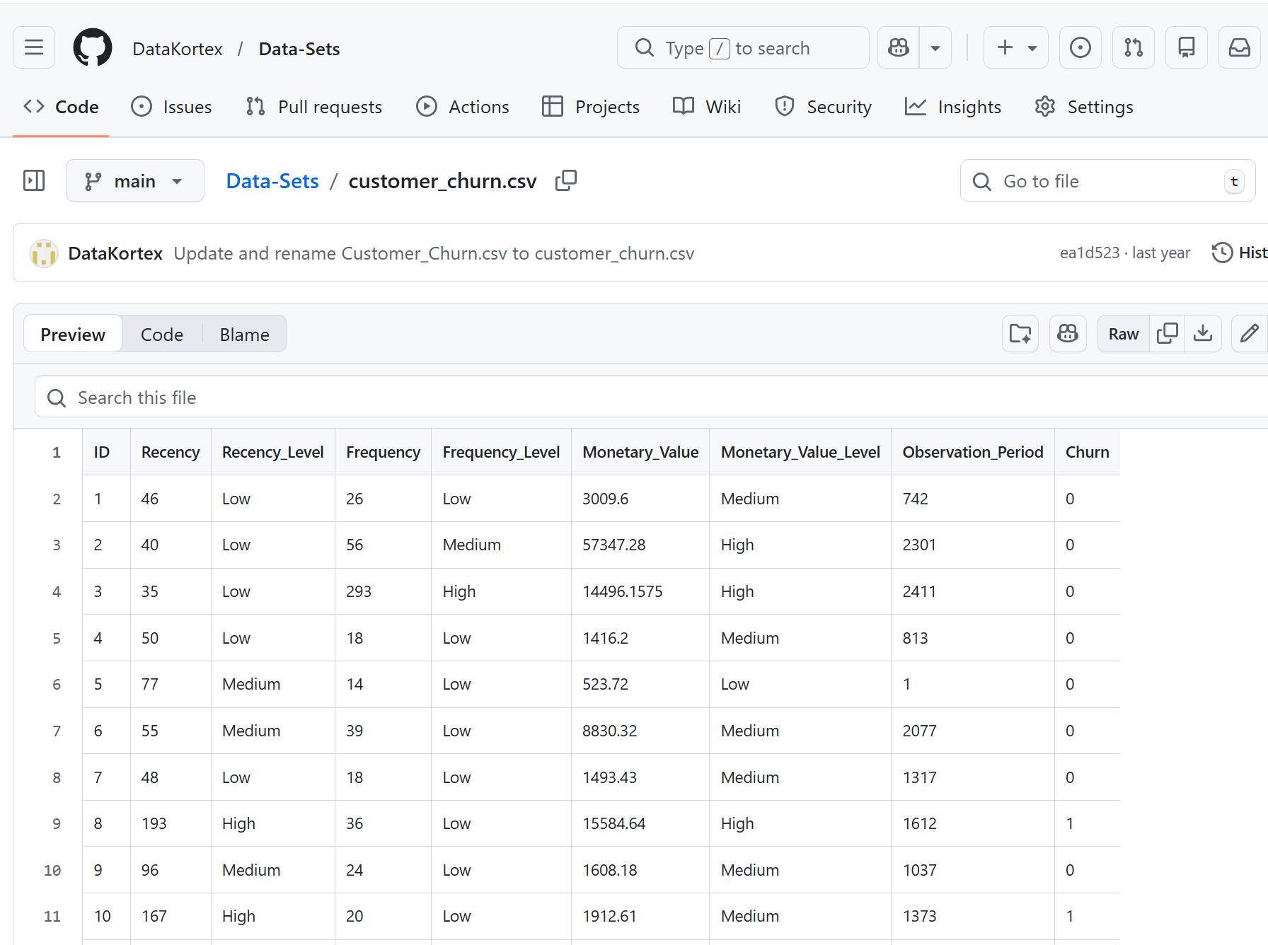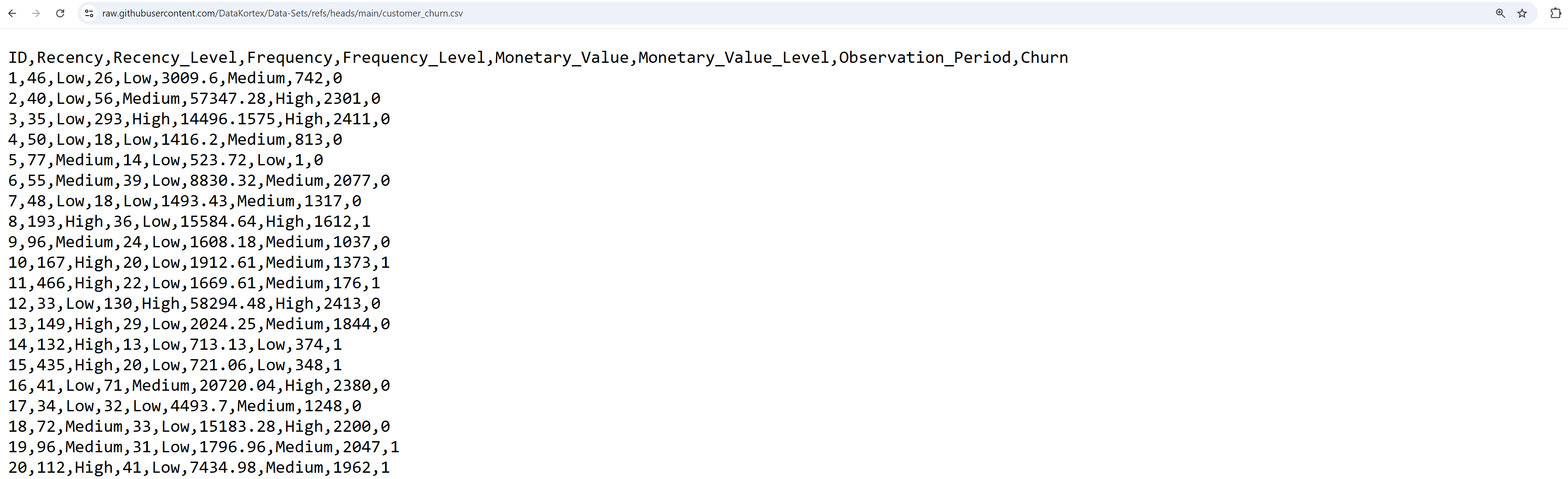 In addition to importing files from local directories, R also allows direct data import from online sources such as GitHub repositories. GitHub is a web-based platform for hosting and sharing code, datasets, and collaborative projects. It is one of the most widely used platforms for collaboration and storing code. Although GitHub offers many features, we don’t need to explore them in detail here. Our goal is simply to see how we can import a dataset from such platforms. Many of these datasets can be accessed directly via their URLs. For instance, suppose we want to import the publicly available customer_churn dataset from GitHub: https://github.com/DataKortex/Data-Sets/blob/main/customer_churn.csv