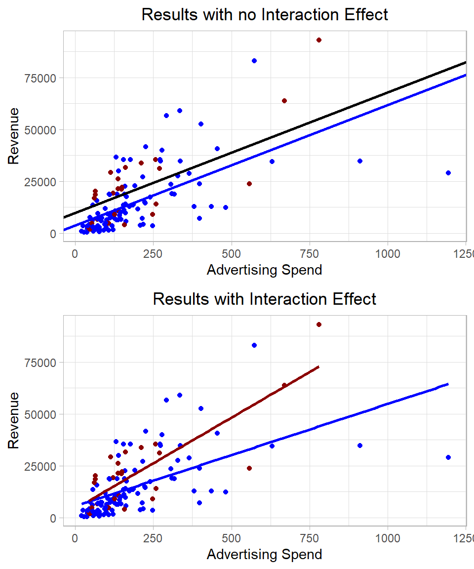 Figure 26.5: Linear regression including interaction and no interaction terms.