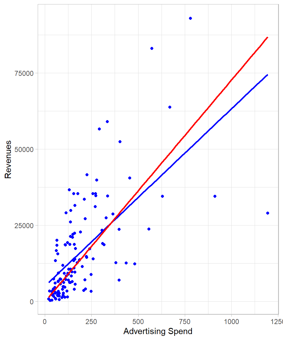 The plot below shows the regression lines of Revenue on Ad_Spend, with the standard regression line including an intercept in blue, and the regression through the origin shown in red: