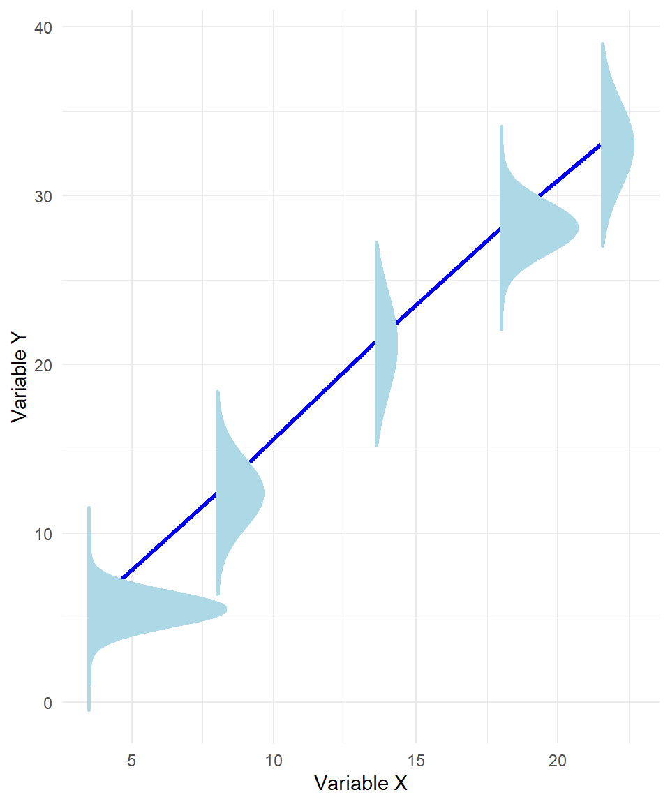 The plot below illustrates a key assumption of linear regression: that the response variable \(y\) follows a normal distribution around the regression line at every value of \(x\). At several points along the line, we’ve visualized this by drawing normal distribution “tunnels”, each centered at the predicted value of \(y\) for a given \(x\). This highlights the normality assumption of the errors—that the variability in \(y\) at each level of \(x\) is random and normally distributed. If this assumption holds, and the relationship between \(x\) and \(y\) is truly linear, then the red regression line represents the best possible linear estimate of the expected value of \(y\) given \(x\). In other words, under these conditions, there is no better straight line we could draw to capture the average behavior of \(y\) across values of \(x\).
