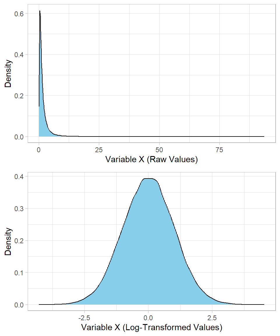It is apparent that the variable x is heavily skewed to the right on its original scale. But once we take the logarithm, the transformed values form a nice, symmetric bell-shaped curve.