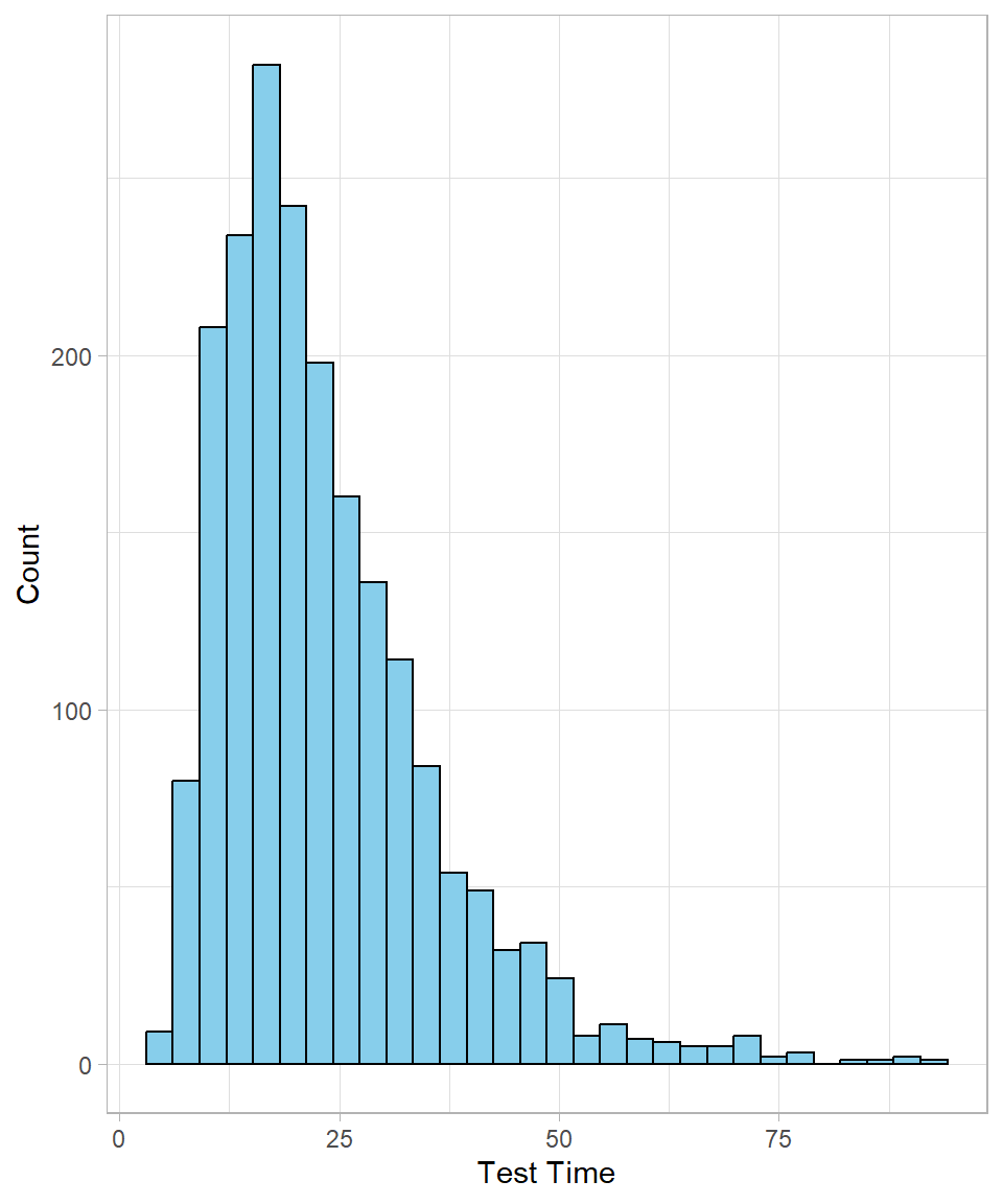 This histogram shows the characteristic right-skewed shape of the log-normal distribution: most students finish around the lower end of the range, but a few take much longer.