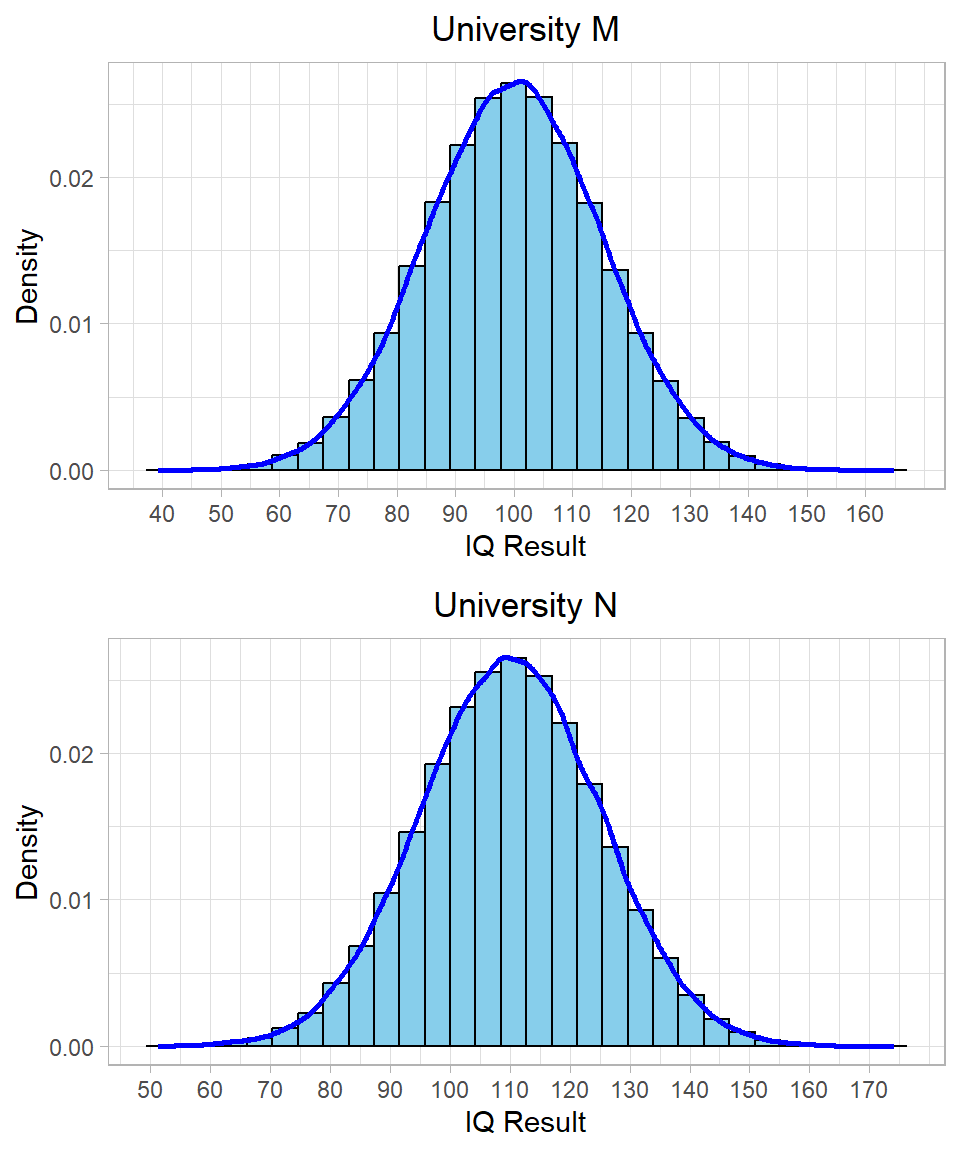 To see how each method works in practice, let’s assume we have collected two samples from two universities: University M and University N. These samples reflect IQ test results of students and both follow a normal distribution. The average IQ in the first sample (University M) is 100, while the average in the second sample (University N) is 110. In both cases, the standard deviation is 15. The distributions of these two samples are visualized below: