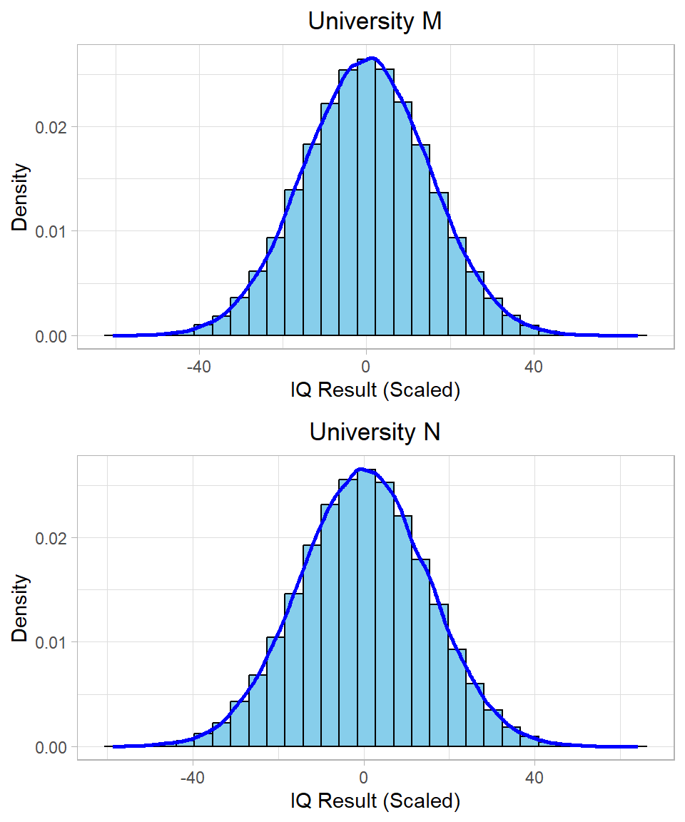 If we had only looked at the raw IQ scores, we might have concluded that the University M student performed worse (comparing to their peers). But after centering, we see that both students performed exactly at the average level within their respective groups. Centering removes the influence of differing means and allows for fairer within-group comparisons.