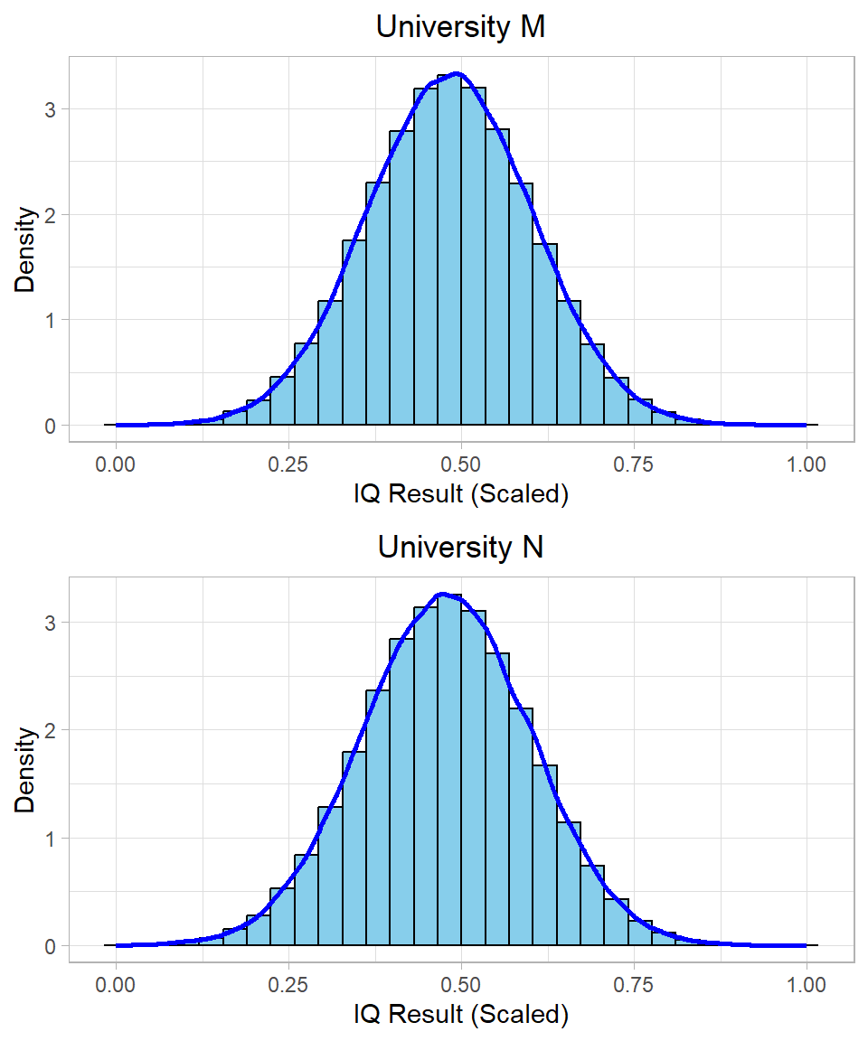 In our case, both university IQ samples had similar shapes and ranges, so the distributions after min-max scaling remain comparable. Yet, it’s important to keep in mind that this method focuses on range-based comparison rather than distance from the mean, in contrast to centering.