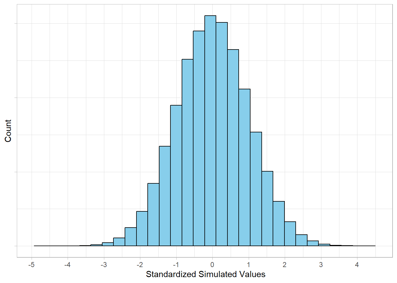 Figure 19.1: Histogram of simulated values from a normal distribution.