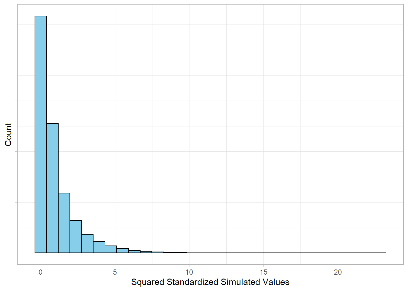 Next, we square all the standardized values, so that each \(x_i\) becomes \(x^2_i\) . Squaring has two effects: all negative values become positive, and 0 remains the minimum value. The resulting distribution is right-skewed, as shown below: