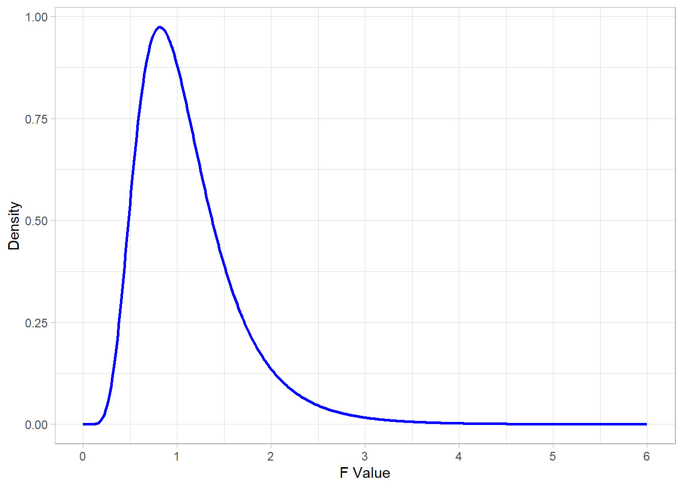 Just like the chi-square distribution, the F-distribution is skewed to the right, especially when the degrees of freedom are small. Using the function rf(), we can simulate F values by specifying the degrees of freedom for the two distributions of interest: