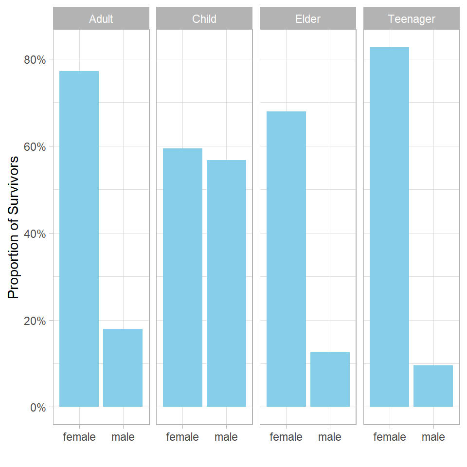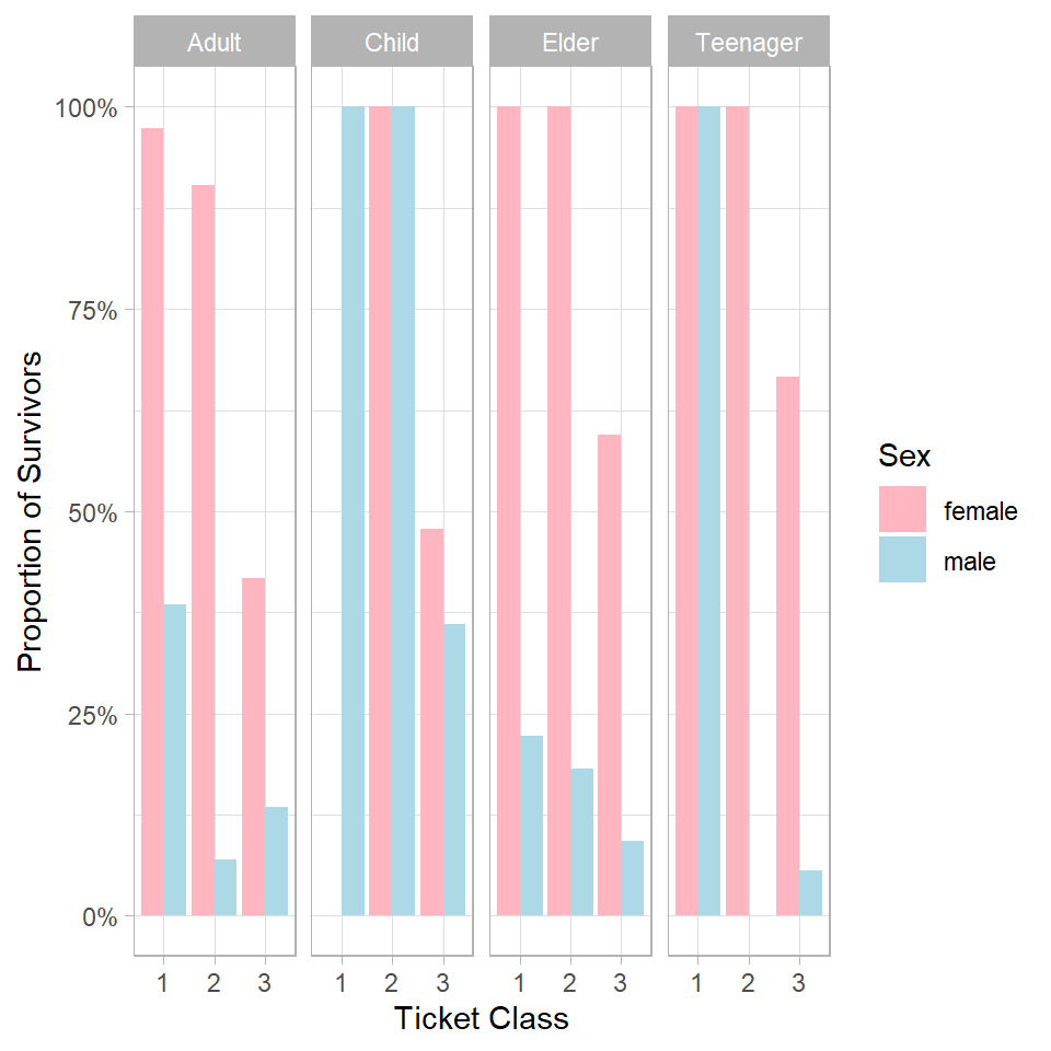 This case study has explored proportions of survivors on the Titanic by examining the interplay between gender, age categories, ticket class, and travel companionship.