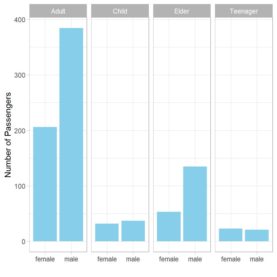 As expected, the proportion of survivors among children is high and roughly equal between males and females. However, we also notice that female teenagers and female elders have significantly higher proportions of survivors than their male counterparts, just like adult females do. Does this imply that teenage girls and elderly women were also given higher priority than males in those groups? It’s possible. But before drawing firm conclusions, we should consider the number of passengers in each group. If a group has only a few individuals, a single survivor can disproportionately influence the proportion of survivors.