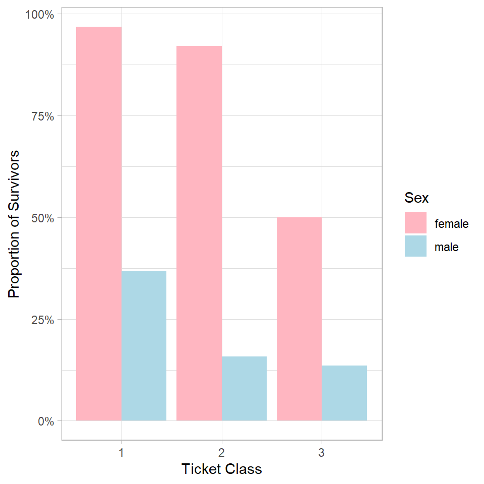 To answer this, we calculate the proportion of survivors separately for males and females within each of the three ticket classes, and place ticket class on the x-axis.