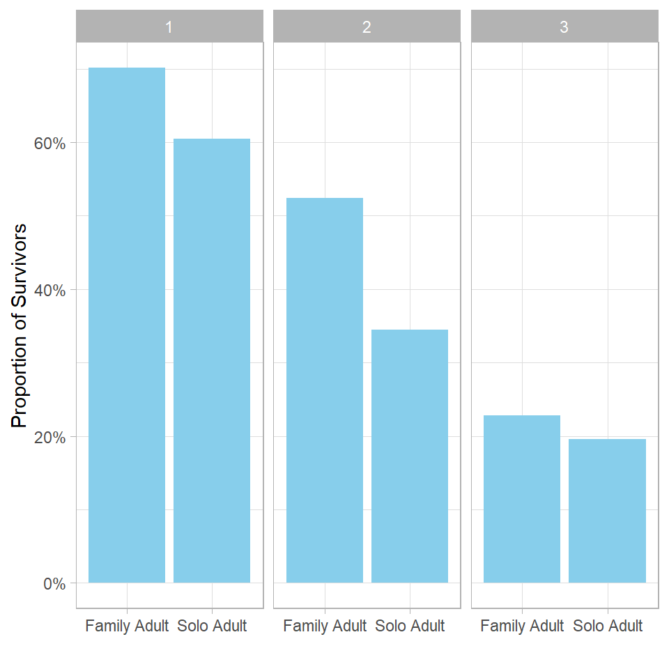 Additionally, we create a new variable called Adult_Type, which takes the value "Solo Adult" if both SibSp and Parch are zero, indicating the passenger was traveling solo. Otherwise, it takes the value "Family Adult". Then, using group_by() and summarize(), we calculate the proportions of survivors for these two adult groups across the different ticket classes and plot the results using facets for each Pclass: