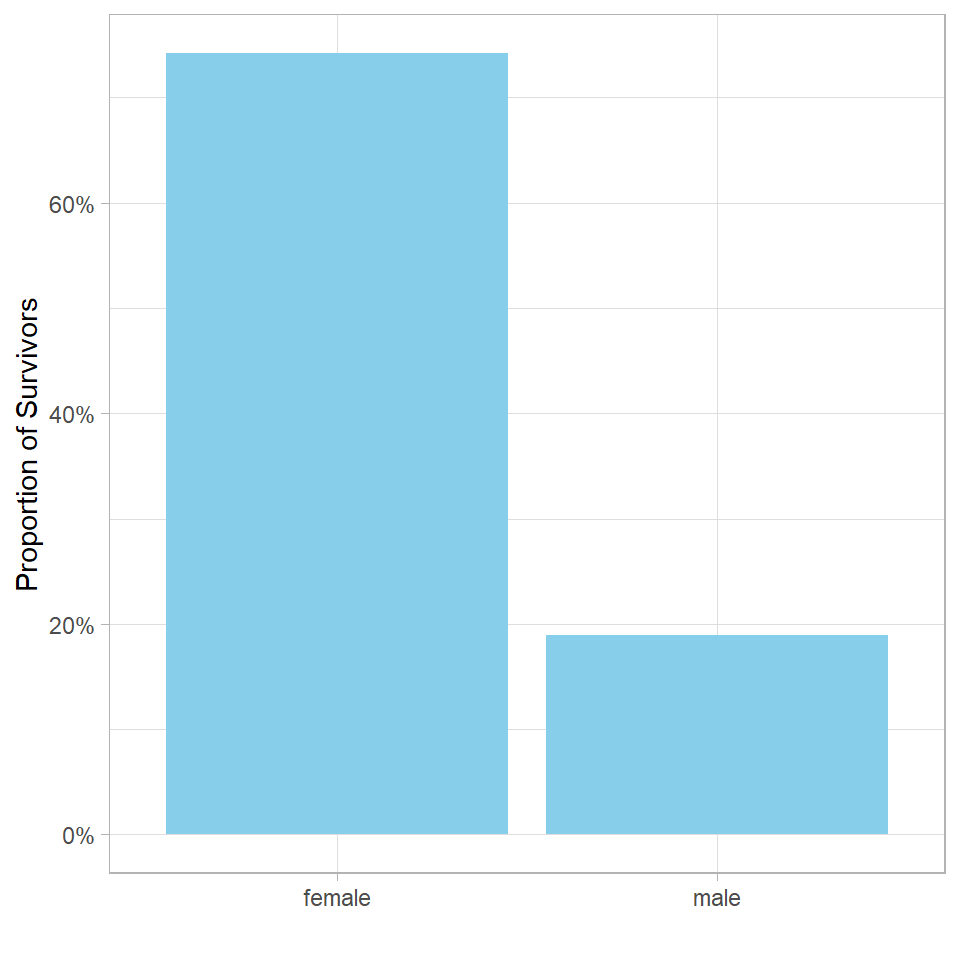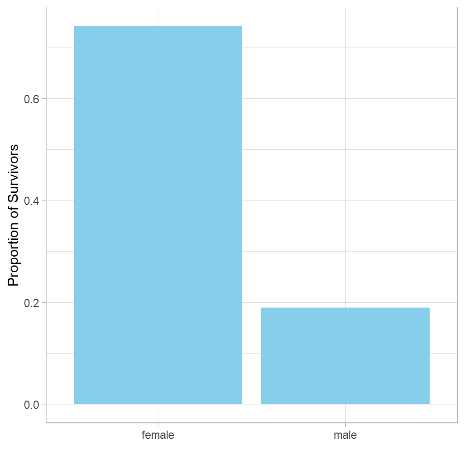 This gives us the proportion of survivors for each gender, which we can now visualize. Since we’re specifying both x and y aesthetics, we use geom_col() instead of geom_bar() to create the plot: