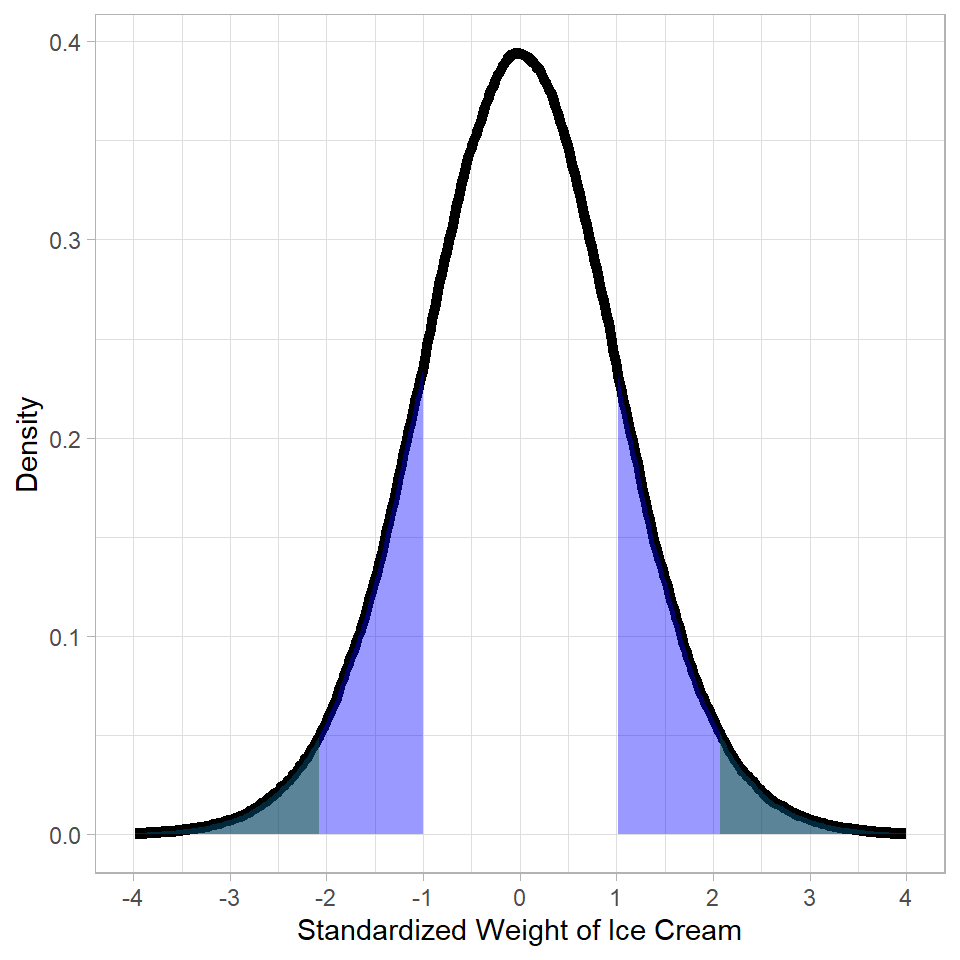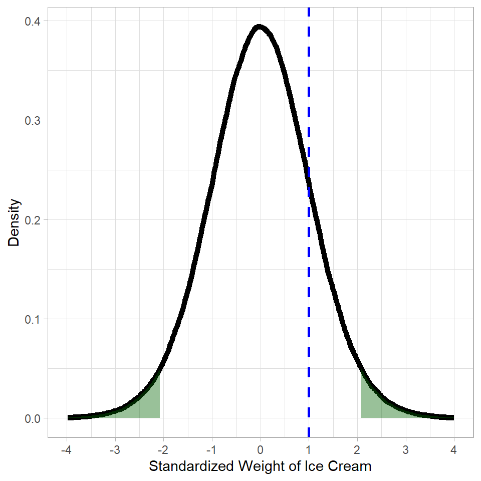 Of course, we would never expect the parameter \(\mu\) to be exactly equal to 1000. Our concern is whether \(\mu\) differs significantly from the value of 1000. More precisely, we care about whether the difference between \(\mu\) and 1000 is statistically significant. If this difference is statistically significant, then we reject the null hypothesis that \(\mu\) is equal to 1000. As a result, we turn to the alternative hypothesis, which states that \(\mu\) is not equal to 1000. This would mean that, based on our statistical inference, the average weight of a box of ice cream is significantly lower or higher than 1000 grams.