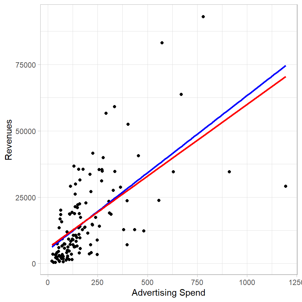 In the plot below, Ad_Spend is on the x-axis and Revenue is on the y-axis. The blue line represents the regression line from a simple linear regression of Revenue on Ad_Spend only. The red line, on the other hand, represents the fitted values from the multiple linear regression where we regress Revenue on both Ad_Spend and Product_Quality_Score. To show the red line in two dimensions, we hold Product_Quality_Score fixed at its mean value. This allows us to isolate the effect of Ad_Spend while controlling for the quality score.