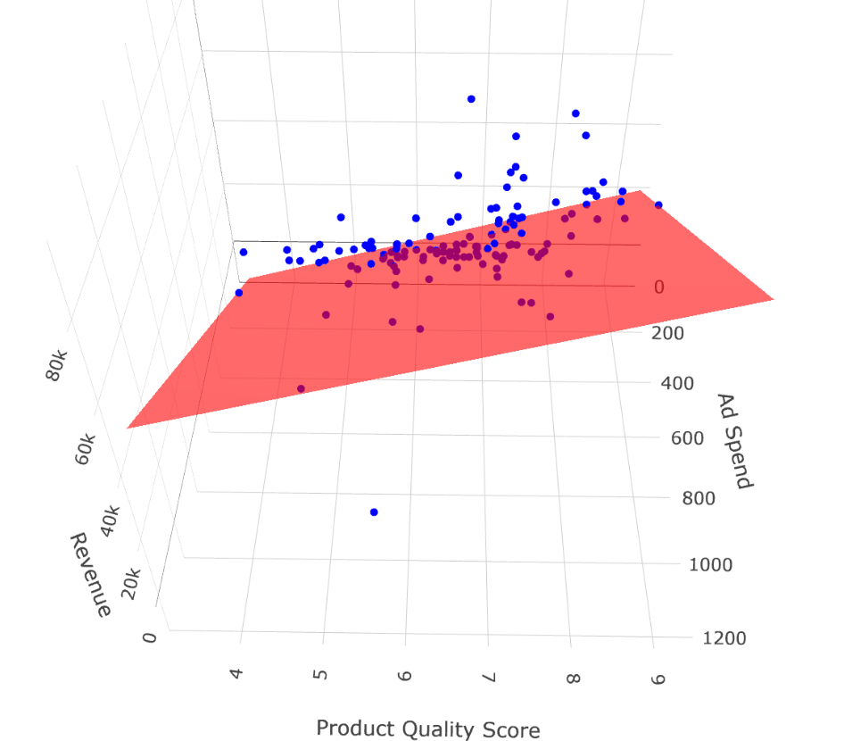 To better understand how the multiple regression works in three dimensions, we can visualize the regression plane. In the next plot, we display a 3D surface that shows how Revenue changes with both Ad_Spend and Product_Quality_Score. Each point represents an observation, and the red plane is the best linear fit across both predictors: