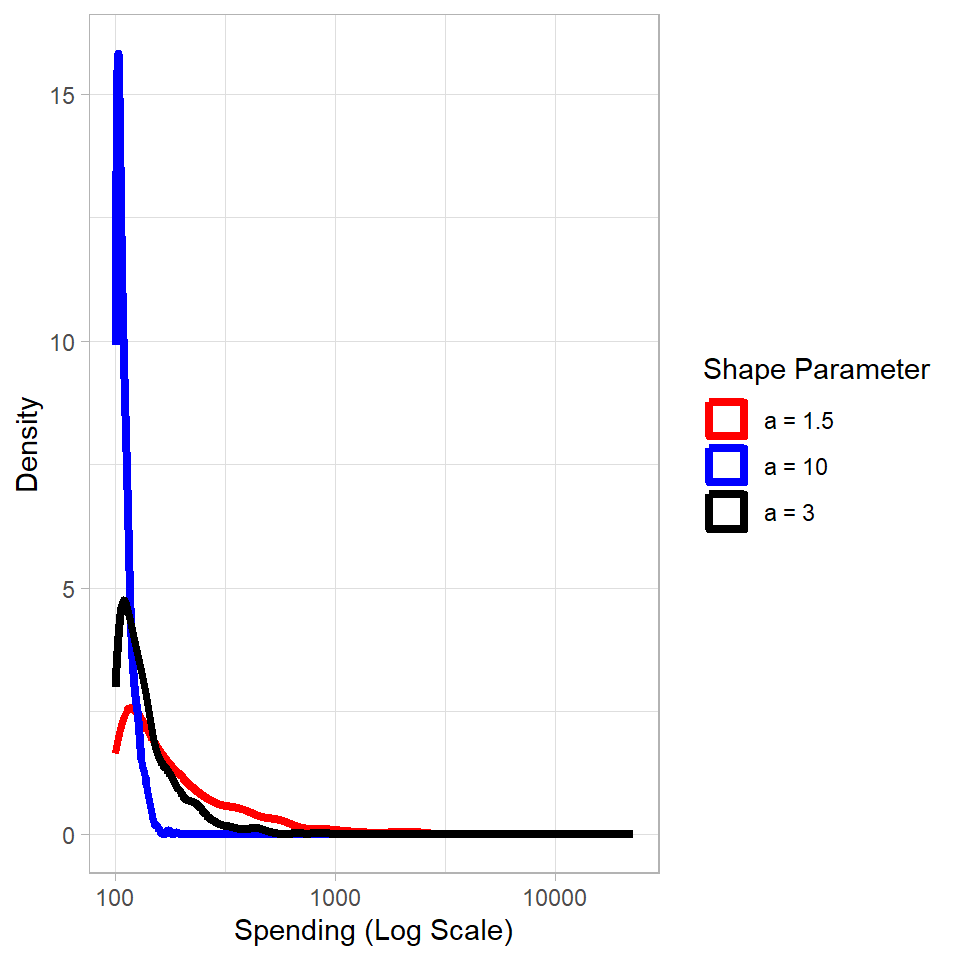 As expected, this distribution is right-skewed, with most values clustered near the minimum value (2000) and a few large values extending into the tail. Since the shape parameter is quite large (\(\alpha\) = 10), the tail is relatively light, and extreme values would occur less frequently compared to smaller \(\alpha\) values.