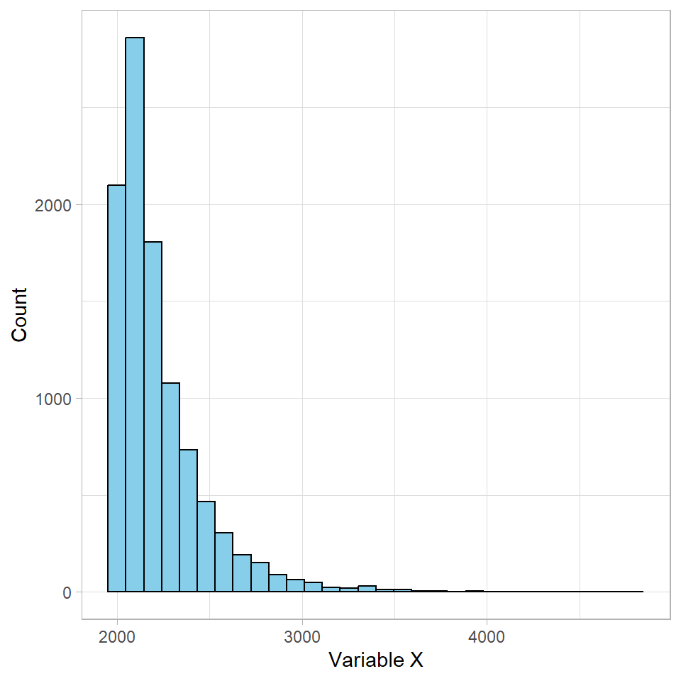 Let’s simulate 10,000 observations from a Pareto distribution with shape parameter \(\alpha = 10\) and minimum value \(x_{min} = 2000\):