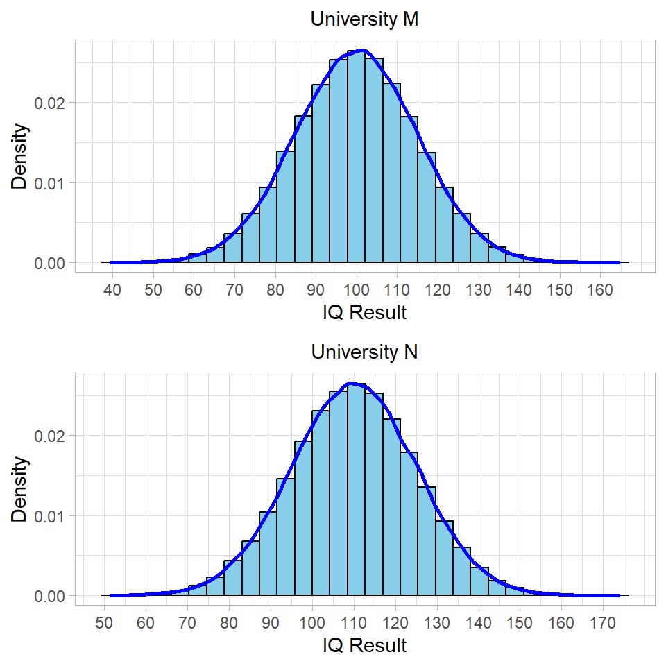 To see how each method works in practice, let’s assume we have collected two samples from two universities: University M and University N. These samples reflect IQ test results of students and both follow a normal distribution. The average IQ in the first sample (University M) is 100, while the average in the second sample (University N) is 110. In both cases, the standard deviation is 15. The distributions of these two samples are visualized below: