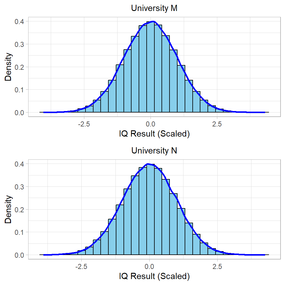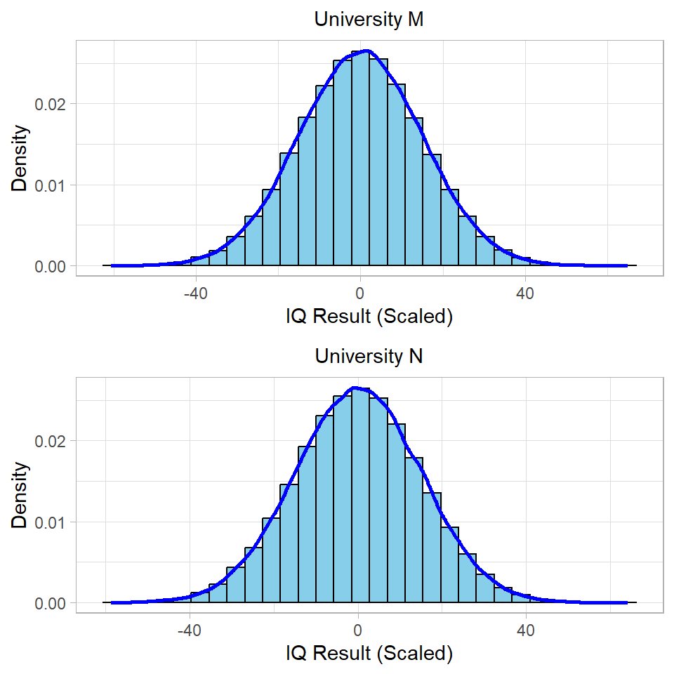 If we had only looked at the raw IQ scores, we might have concluded that the University M student performed worse (comparing to their peers). But after centering, we see that both students performed exactly at the average level within their respective groups. Centering removes the influence of differing means and allows for fairer within-group comparisons.