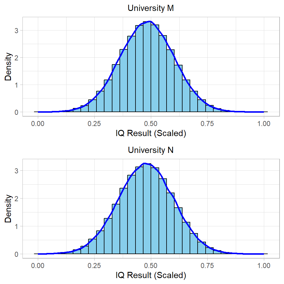 In our case, both university IQ samples had similar shapes and ranges, so the distributions after min-max scaling remain comparable. Yet, it’s important to keep in mind that this method focuses on range-based comparison rather than distance from the mean, in contrast to centering.