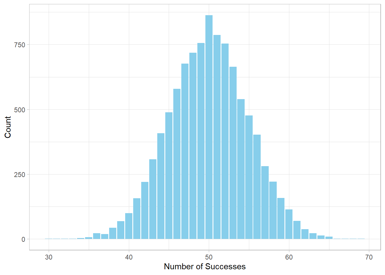 Let’s revisit the simulation, this time using a larger number of trials (100 coins) and setting the probability of success to 0.5: