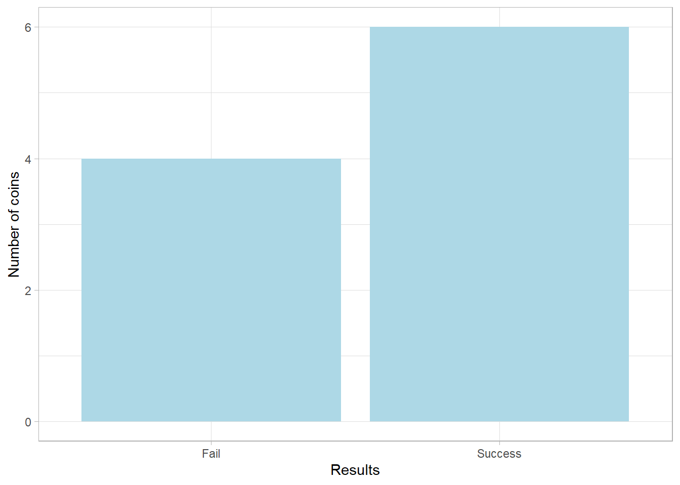 Let’s return to our coin-flipping example. Suppose the probability of getting heads (a success) is 50%. This time, we flip 10 coins in each of 10 rounds, and in every round, we count how many heads we get.
