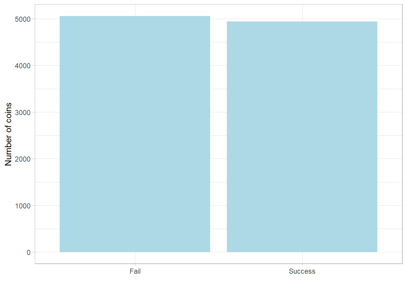 Now the two bars are nearly equal, each around 5,000, just as we would expect with a true 50% chance.