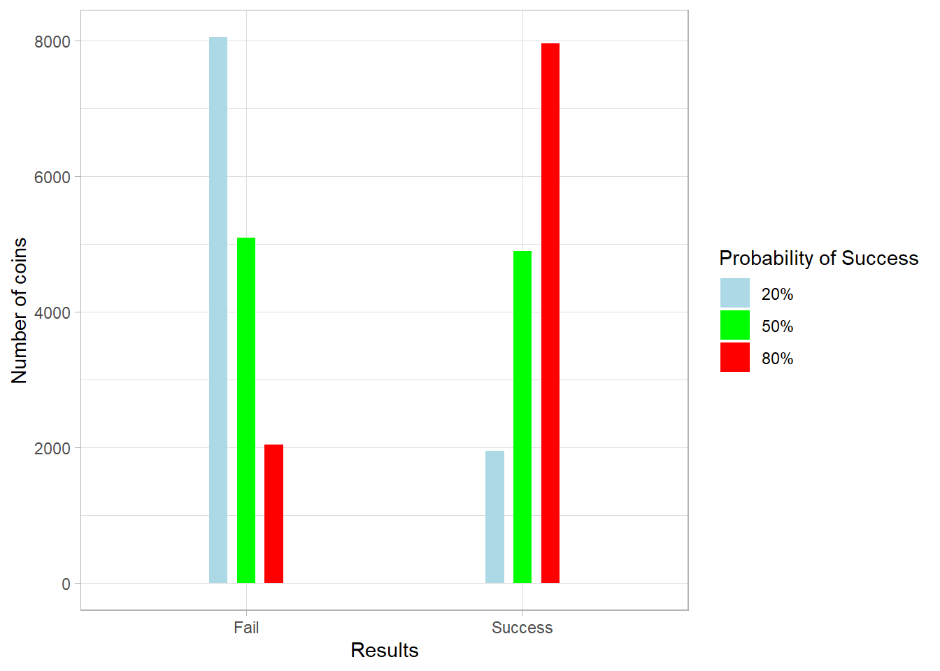 When the probability of success is 20%, around 8,000 outcomes (out of 10,000) are failures. When it is 80%, around 8,000 are successes.