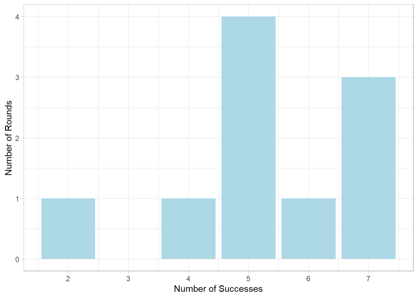 Here, the x-axis shows the number of successes (from 0 to 10), and the y-axis shows how many rounds resulted in each success count. We notice that getting 5 successes per round is quite common. That’s because the probability of success was set to 50%, so 5 out of 10 successes is the most expected outcome.
