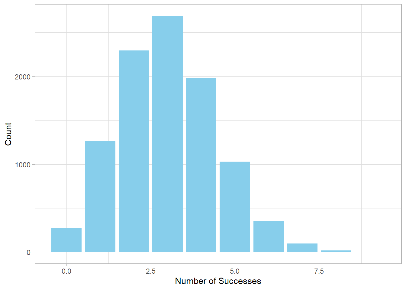 We see that the most frequent outcome is about 3 successes, which aligns with our expectation: 30% of 10 is 3.