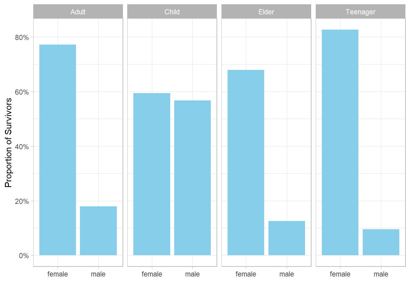 This case study has explored proportions of survivors on the Titanic by examining the interplay between gender, age categories, ticket class, and travel companionship.