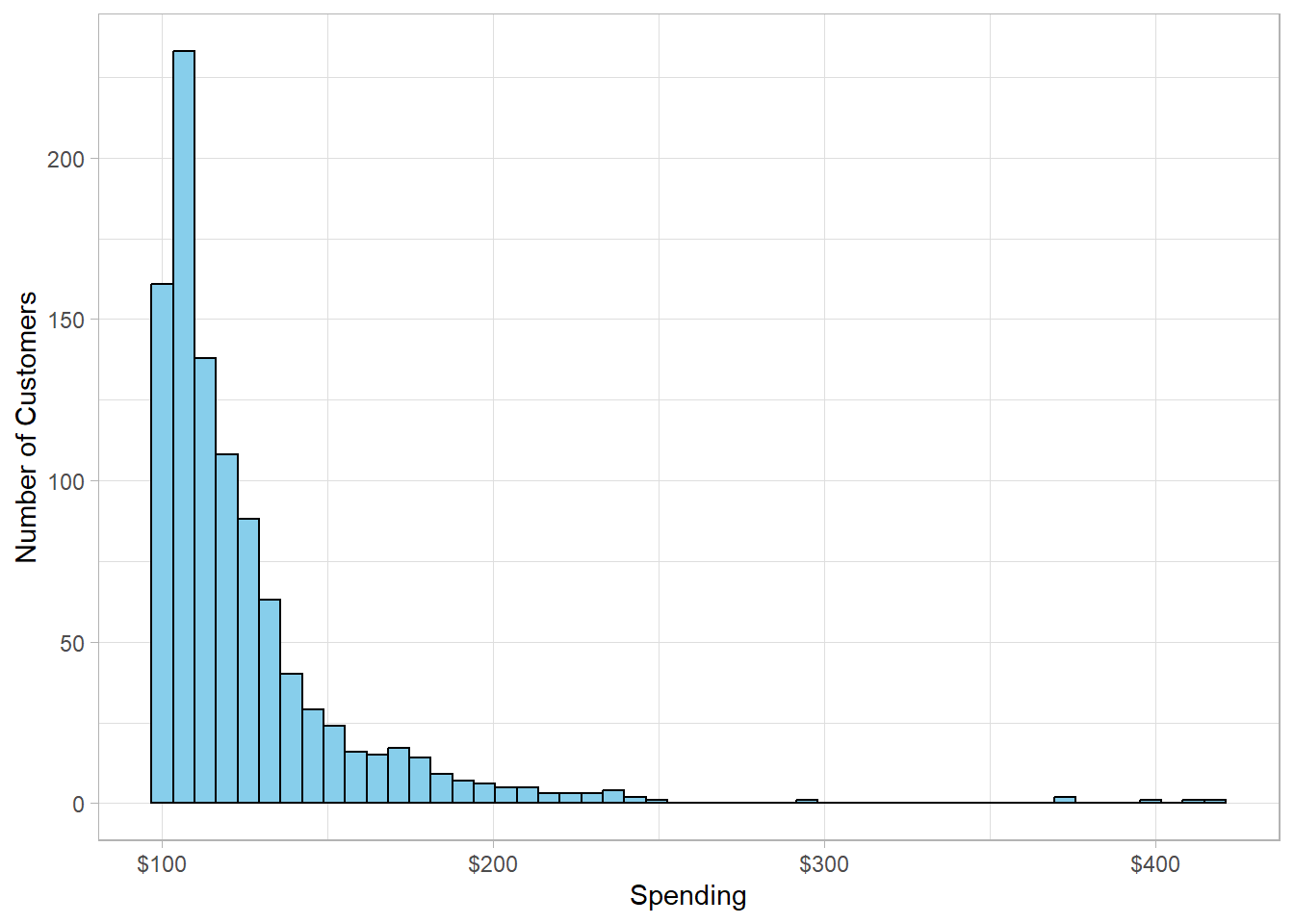 Imagine we run an online store and have data on how much each customer has spent over the past year. We can visualize this spending data as follows:
